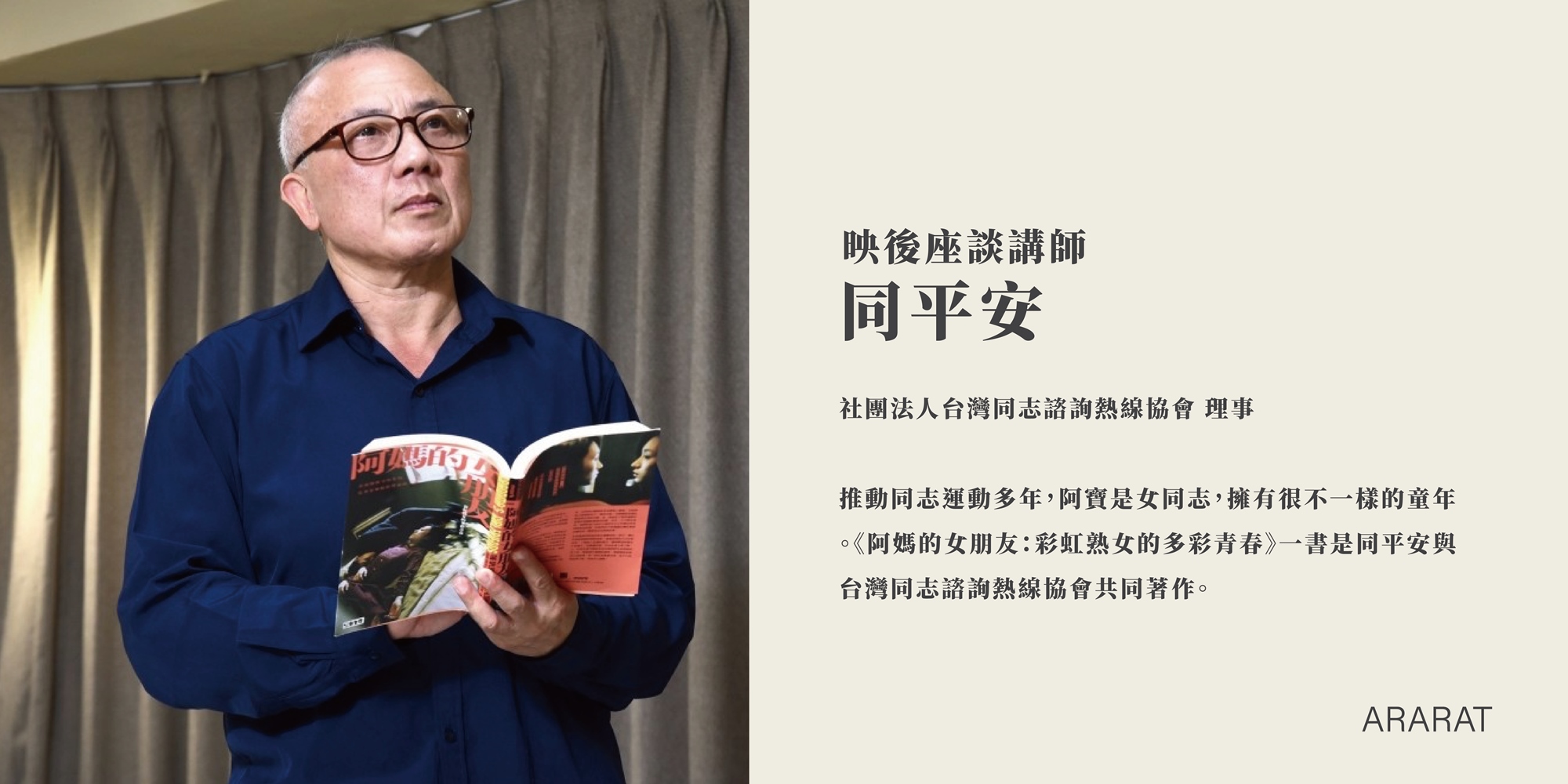 社團法人台灣同志諮詢熱線協會 理事 推動同志運動多年,阿寶是女同志,擁有很不一樣的童年。《阿媽的女朋友:彩虹熟女的多彩青春》一書是同平安與台灣同志諮詢熱線協會共同著作。