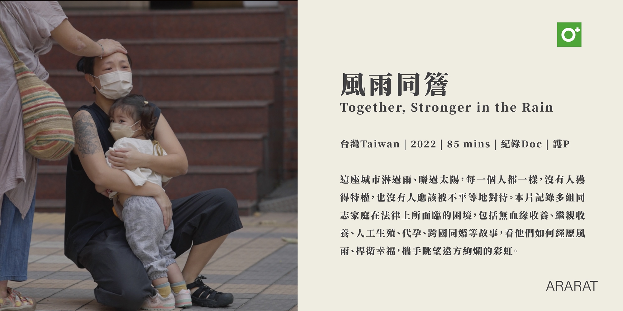 這座城市淋過雨、曬過太陽,每一個人都一樣,沒有人獲得特權,也沒有人應該被不平等地對待。本片記錄多組同志家庭在法律上所面臨的困境,包括無血緣收養、繼親收養、人工生殖、代孕、跨國同婚等故事,看他們如何經歷風雨、捍衛幸福,攜手眺望遠方絢爛的彩虹。