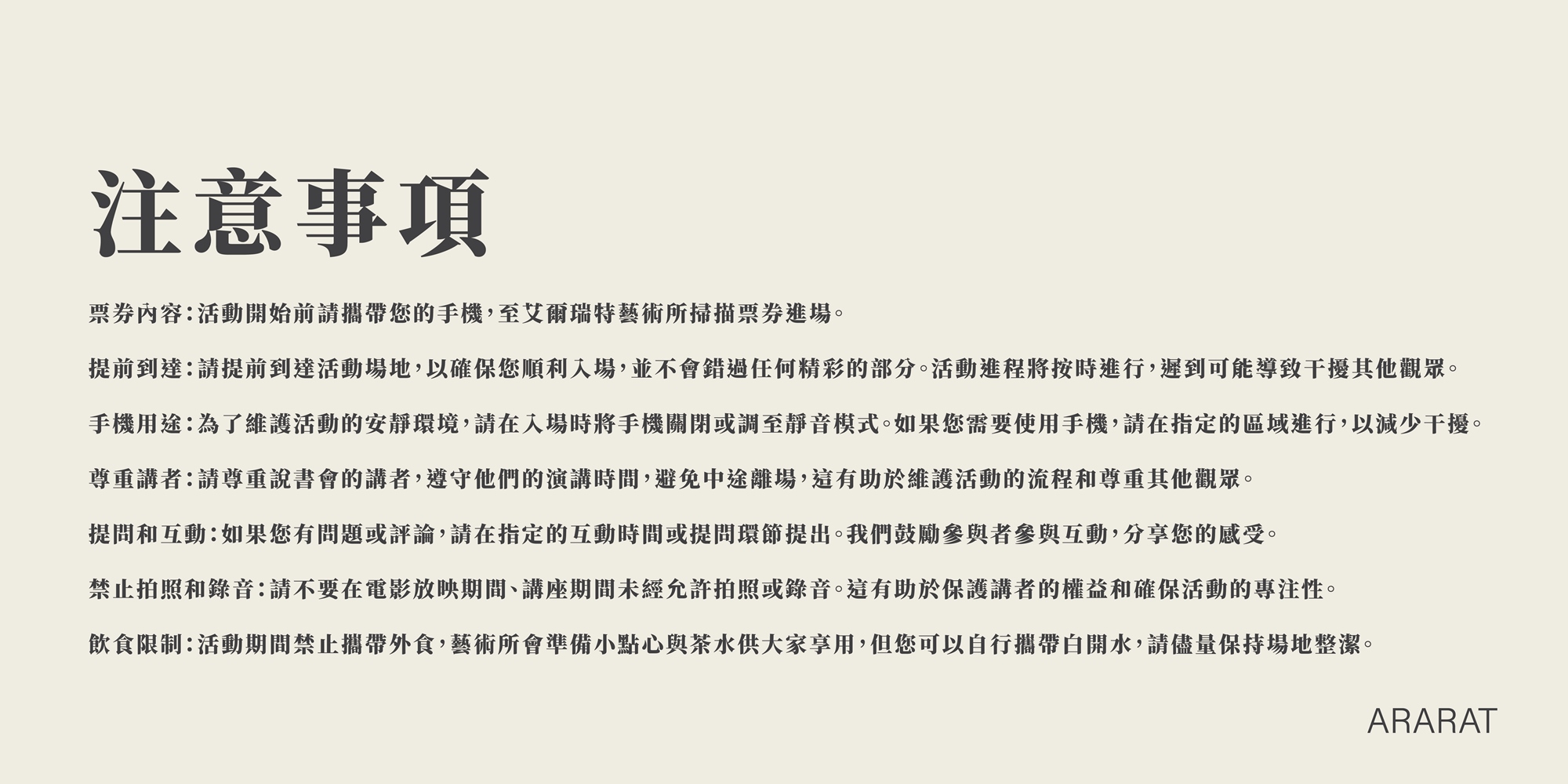 - 飲食限制:活動期間禁止攜帶外食,藝術所會準備小點心與茶水供大家享用,但您可以自行攜帶白開水,請儘量保持場地整潔。