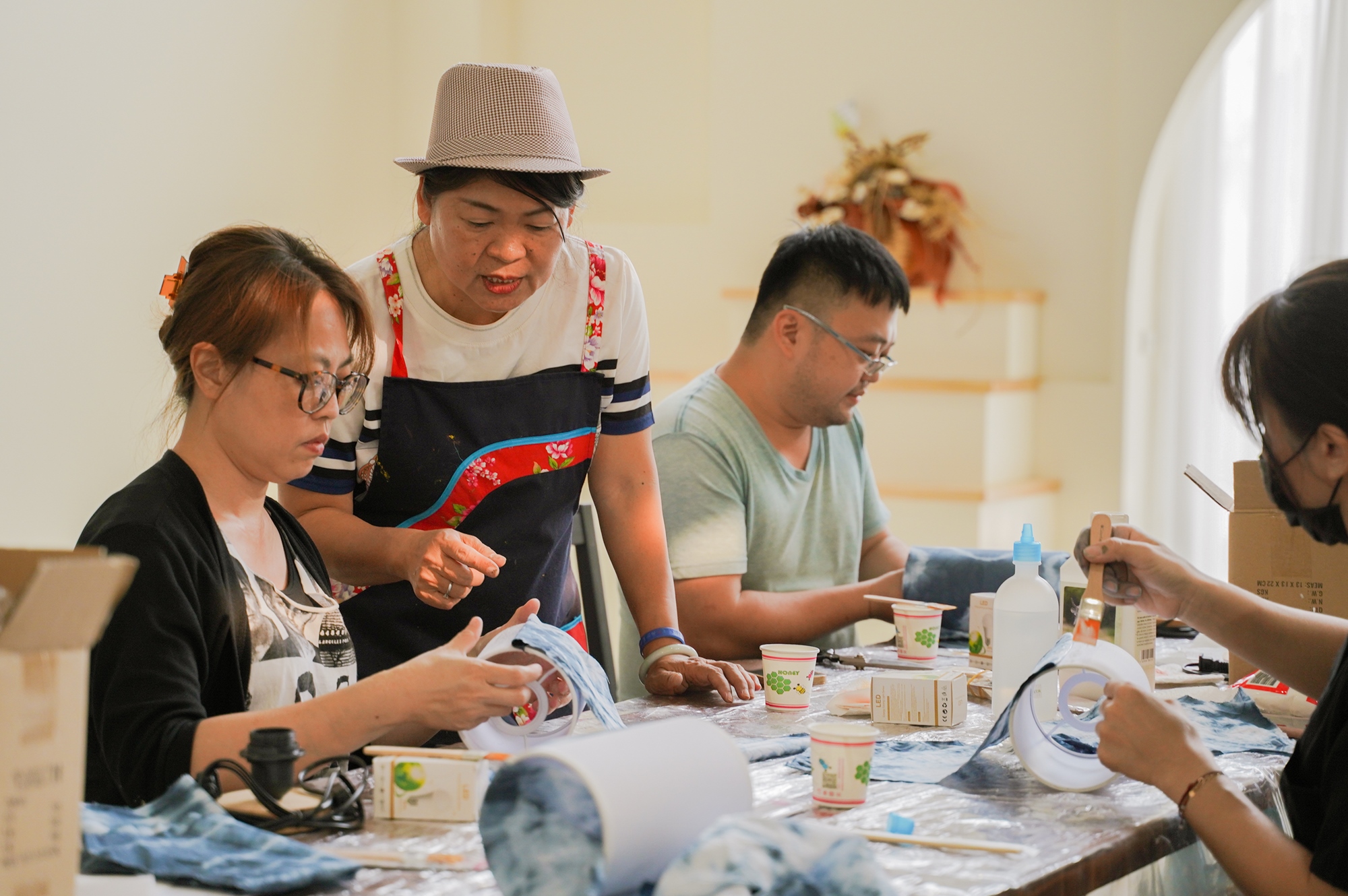 藍染是最具代表性的客家符碼之一,在客家那段和大自然博鬥,最困頓的開荒墾地的歲月裡,一直是扮演著重要的象徵意義。而親手扎綁出的圖騰如山峰綿綿,如星空點點,如波光潾潾…復刻雋永的客家風華與藍染藝術。