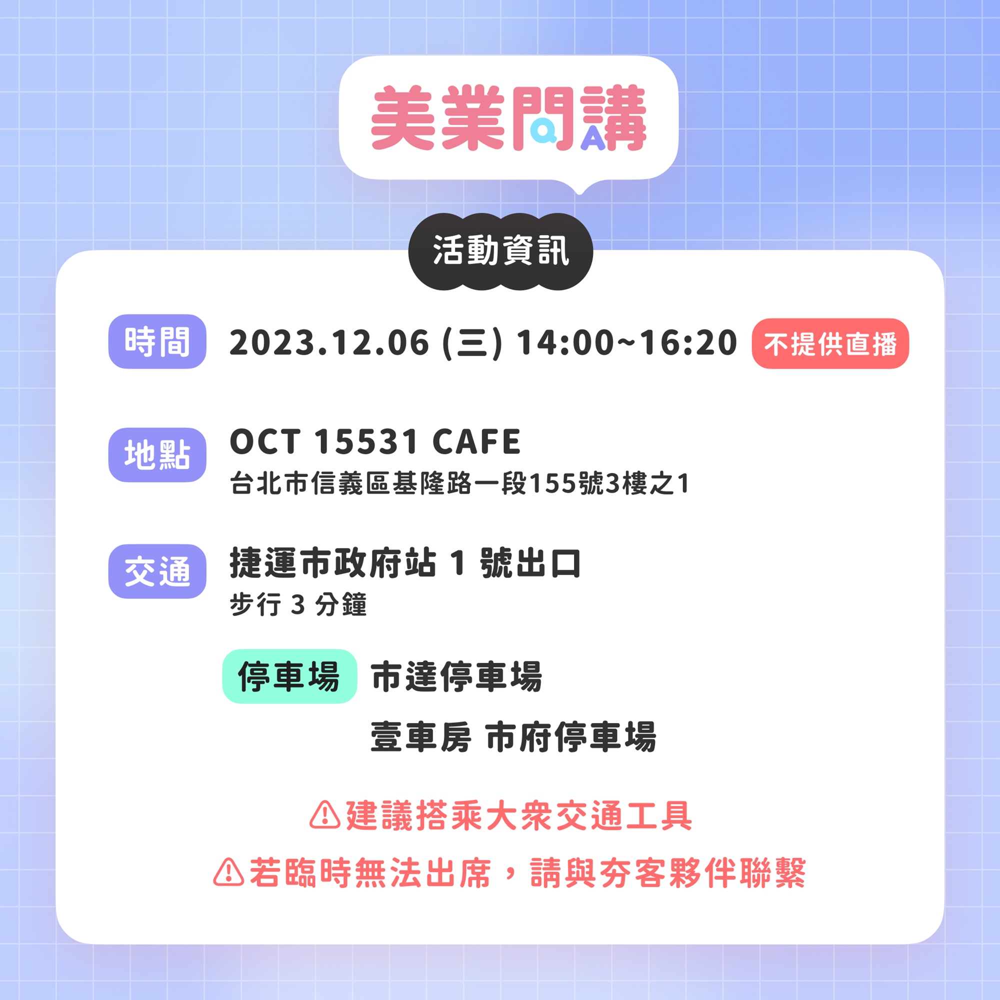 🔸活動地點:OCT 15531 CAFE (捷運市政府站1號出口)