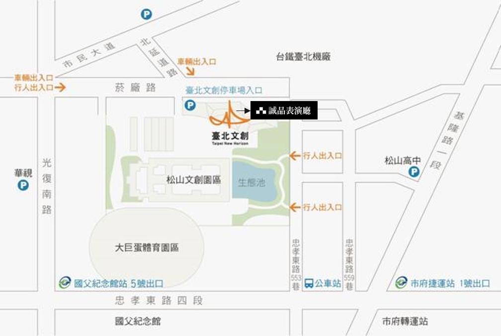 - 地址:台北市信義區菸廠路 88 號,請由「菸廠路」駛入。