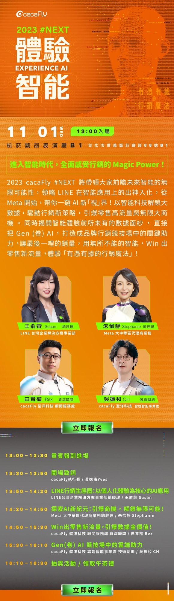 2023 cacaFly #NEXT 將帶領大家前瞻未來智能的無限可性性,領略 LINE 在智能應用上的出神入化,從 Meta 開始,帶你一窺 AI 新「視」界!以智能科技解鎖大數據,驅動行銷新策略,引爆零售高流量與無限大商機。同時揭開智能體驗前所未有的數據面紗,直接把 Gen(捲)AI,打造成品牌行銷競技場中的關鍵助力,讓最後一哩的銷量,用無所不能的智能,Win 出零售新流量,體驗「有憑有據的行銷魔法」!