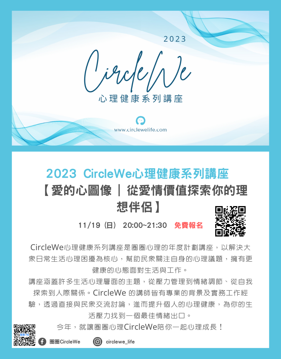 在這場講座中,我們將引導你思考自我愛情價值觀,找出你內心對於愛情的需求與期待,並透過心理學理論,獲得對於心目中理想對象的覺察技巧與方法。