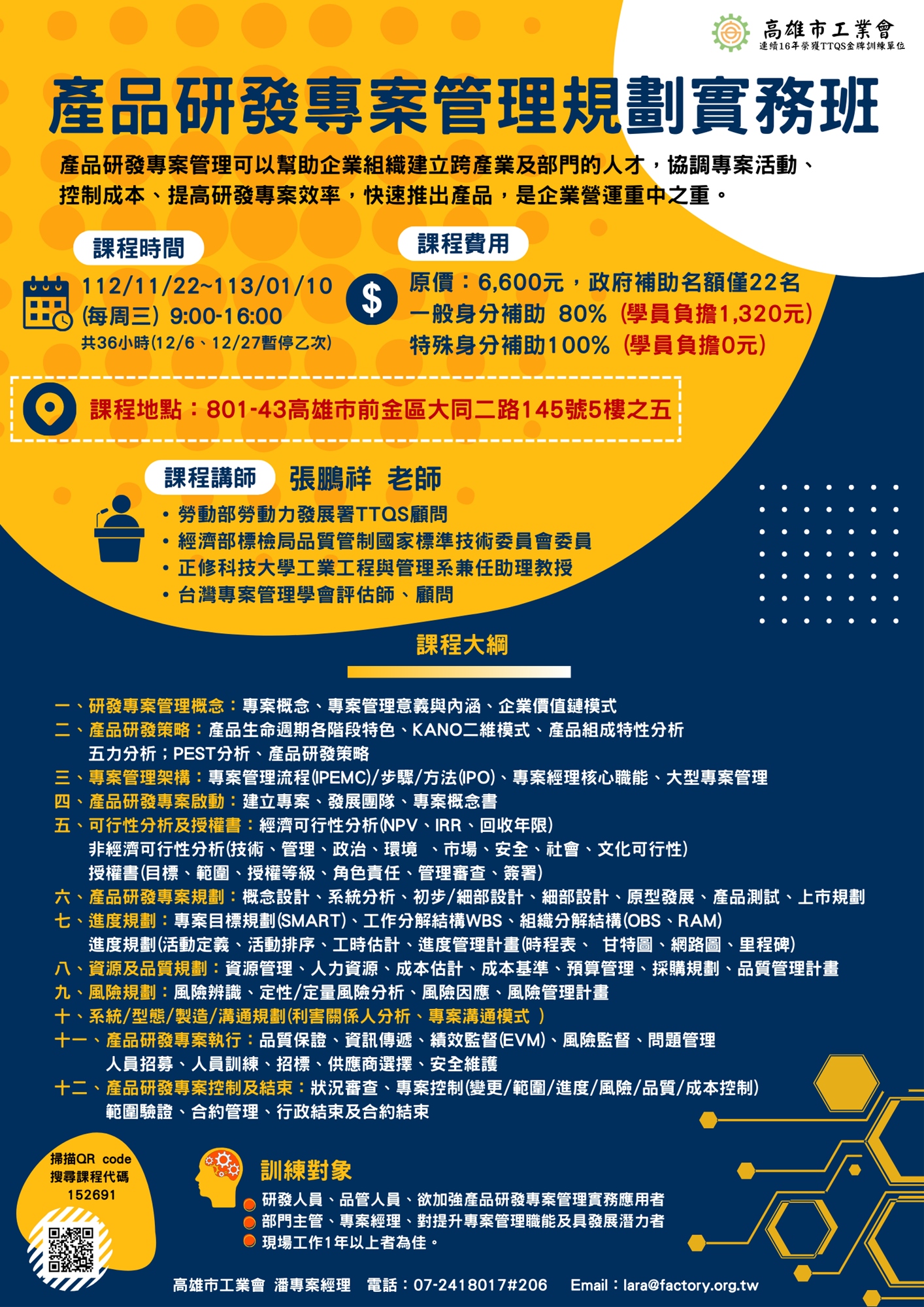 https://ojt.wda.gov.tw/ 報名 (點選「產業人才投資方案」,查詢課程代號:152691)或可來電洽詢並回傳報名表