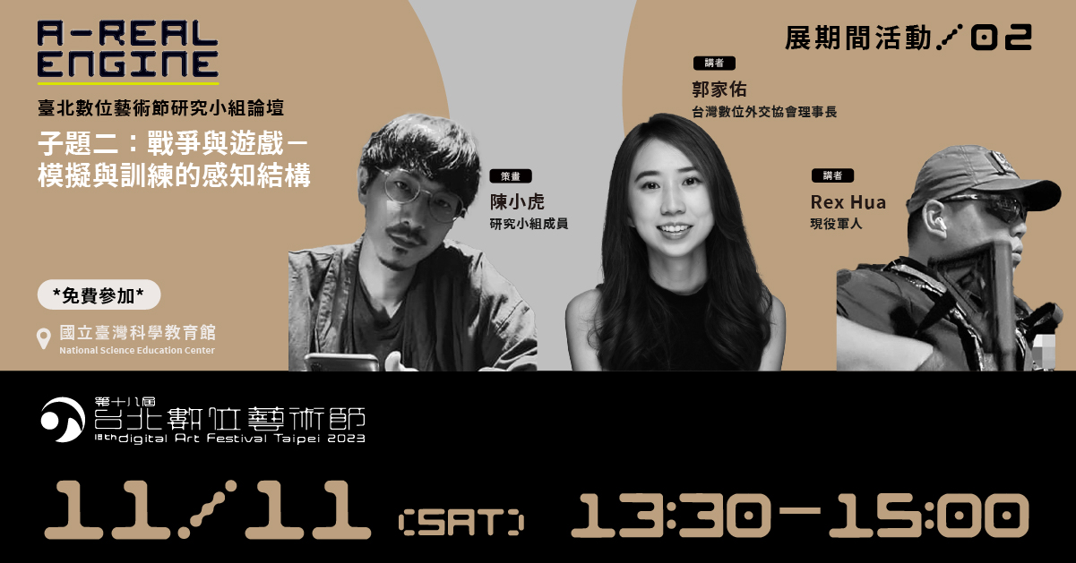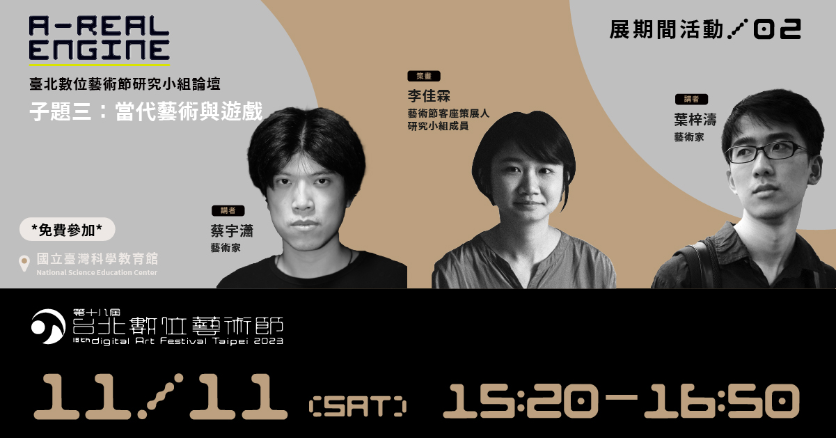 曾參與2022年數位藝術節展出的藝術家暨研究者施懿珊(化名賴火旺)、本屆藝術節主題邀請展策展人李佳霖和資深遊戲玩家陳小虎,應臺北數位藝術節之邀組成研究小組並策劃論壇。三人分別就其迥異的創作、策展和電玩/生存遊戲玩家等經驗,以「遊戲性」為關鍵字,提出觀察心得,藉著半年來定期的線上分享,三人連結自身所關注的研究內容,歸納三個論壇子題——施懿珊策劃的「當 AI 成為人口基數⋯⋯」、陳小虎策劃的「戰爭與遊戲-模擬與訓練的感知結構」和李佳霖策劃的「當代藝術與遊戲」,同時也將邀請國內外來自不同領域的講者們對子題內容進行回應與交流。