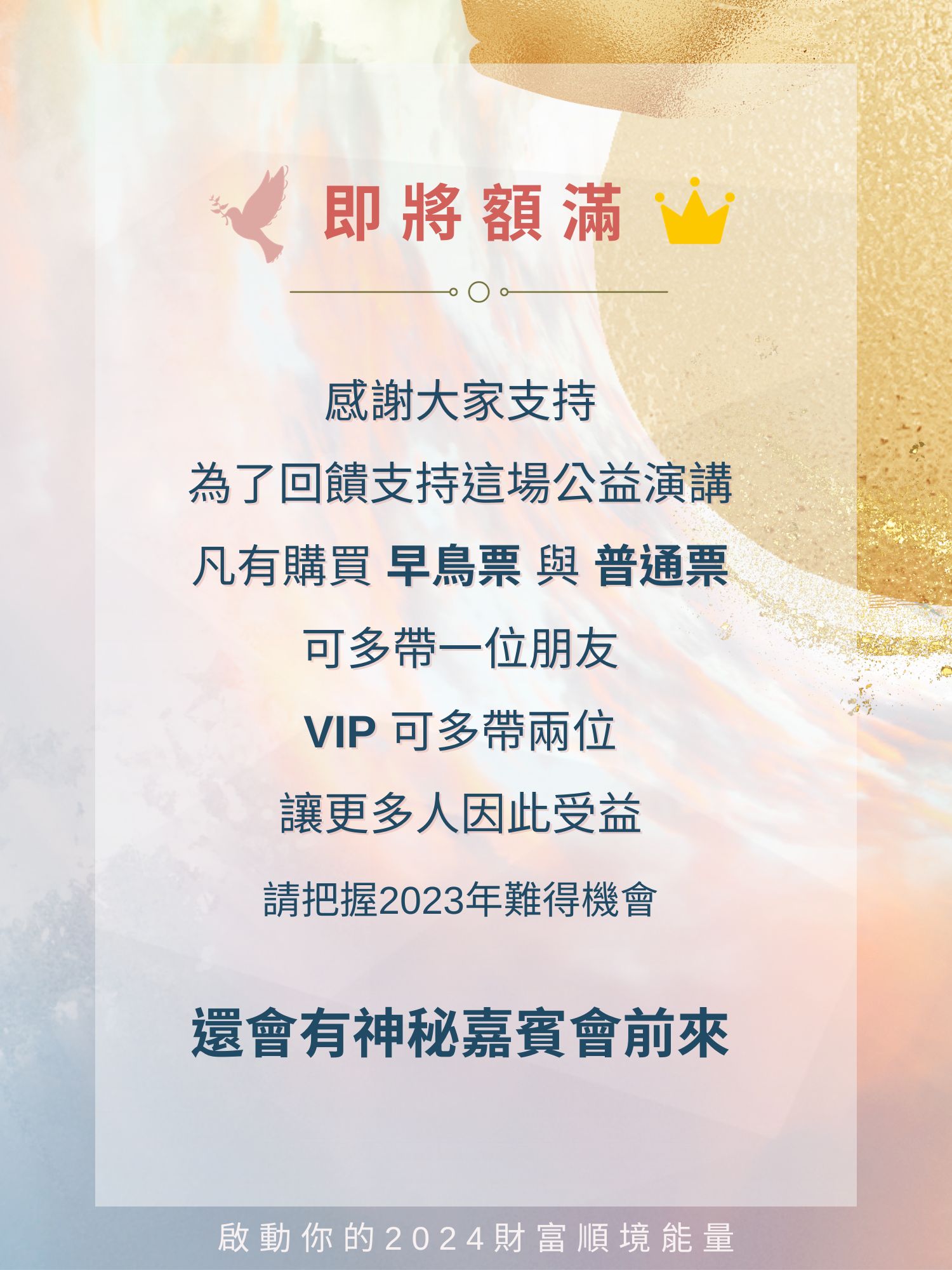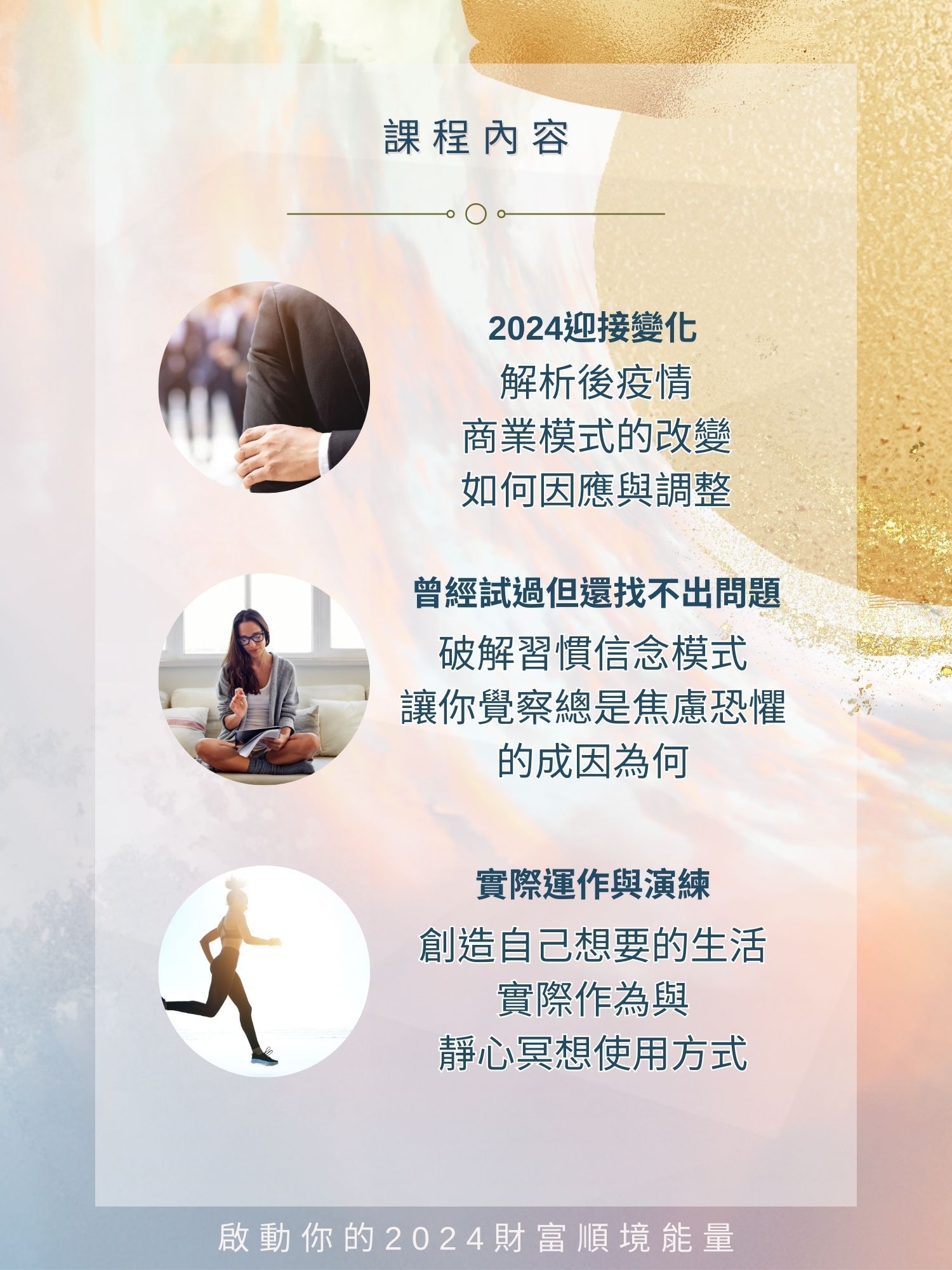 如何呼喚本體能量真正要的東西、如何讓你的人生豐盛順暢、如何讓你的財富源源不絕?在這場活動裡,劉建樺將他與全球一流人士近身接觸的觀察,提供給你最快速、最立竿見影的改變,透過學習讓你的能量得以顯化最好、最理想、最豐盛的人生, 2024年,讓你的人生與滿滿幸福、圓滿、富足、平安、喜悅一起共振。