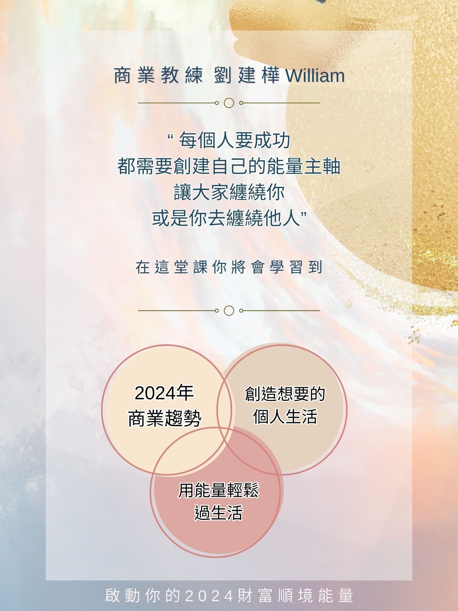 他,是來自台灣的劉建樺(William)老師、《量子成功學之顯化法則》的作者,他將告訴你他與全球一流人士近身接觸的觀察,提供給你最快速、最立竿見影的方法,傳授給你獨門的能量秘技,用新的能量和意識迎接2024,讓你每天都像奇蹟一般,財富豐盛、健康平安、幸福滿滿。