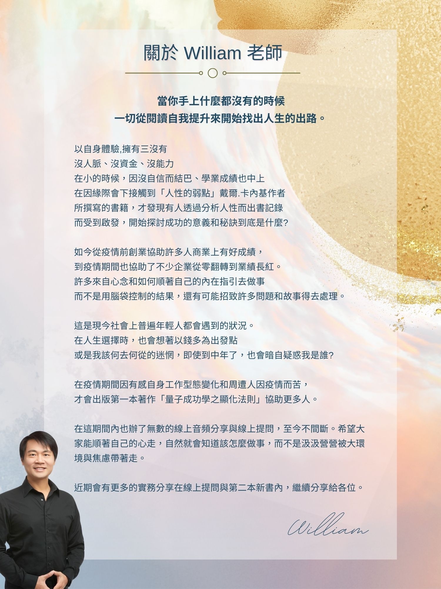 這次是William老師首次在台灣舉辦的線下公益講座,歡迎來到現場一起感受這場生命的饗宴吧!