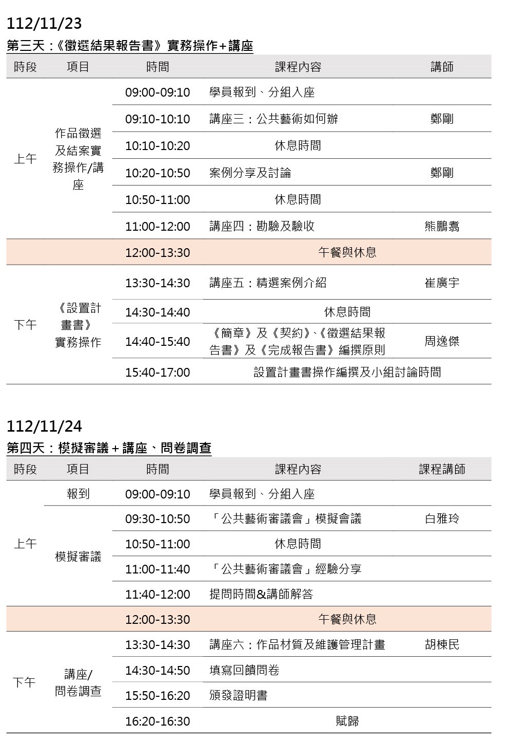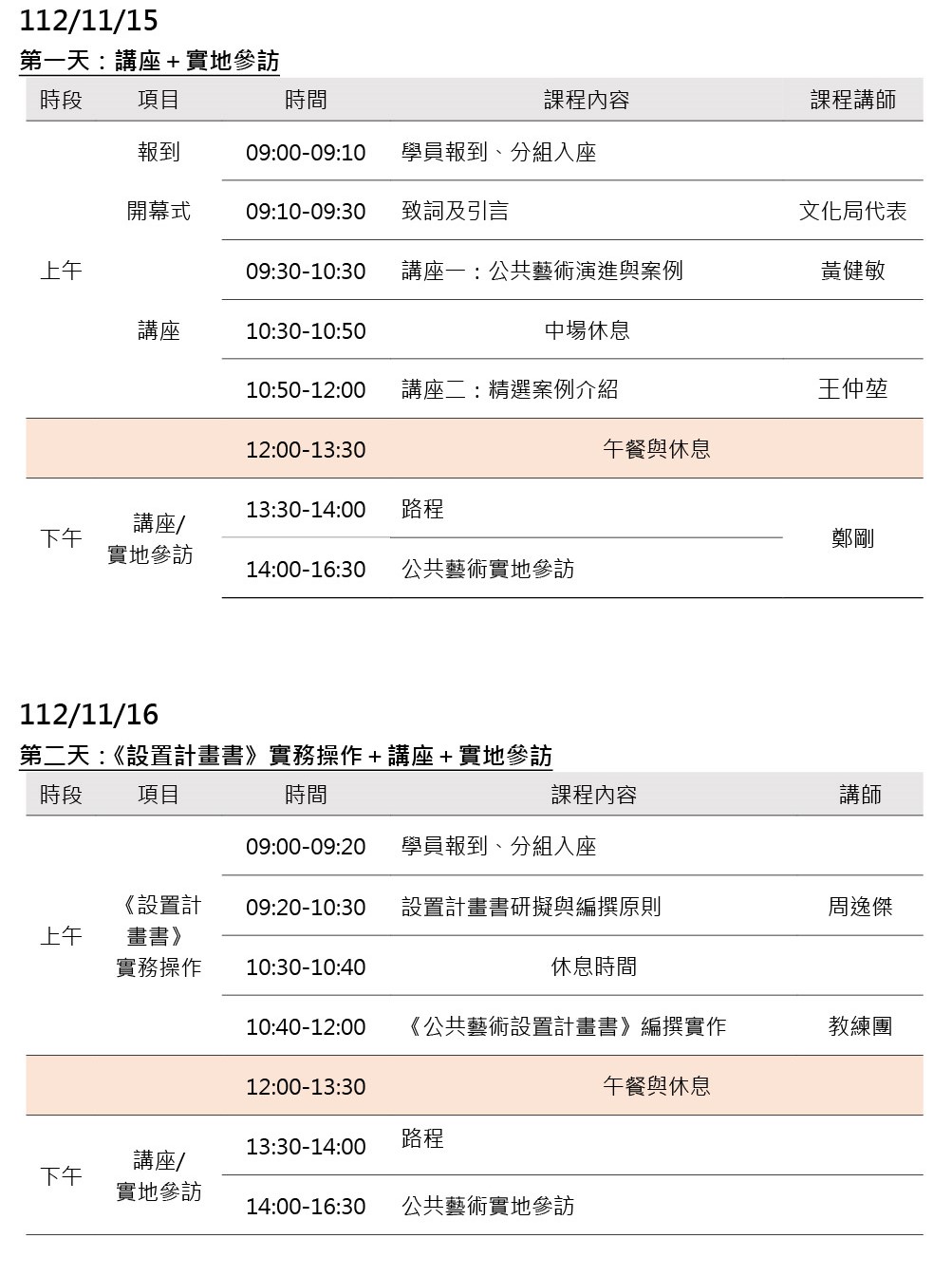 - 對象:臺北市政府各機關及附屬單位、學校公共藝術承辦人員、代辦單位、藝術領域專業人士、藝術領域研究生。