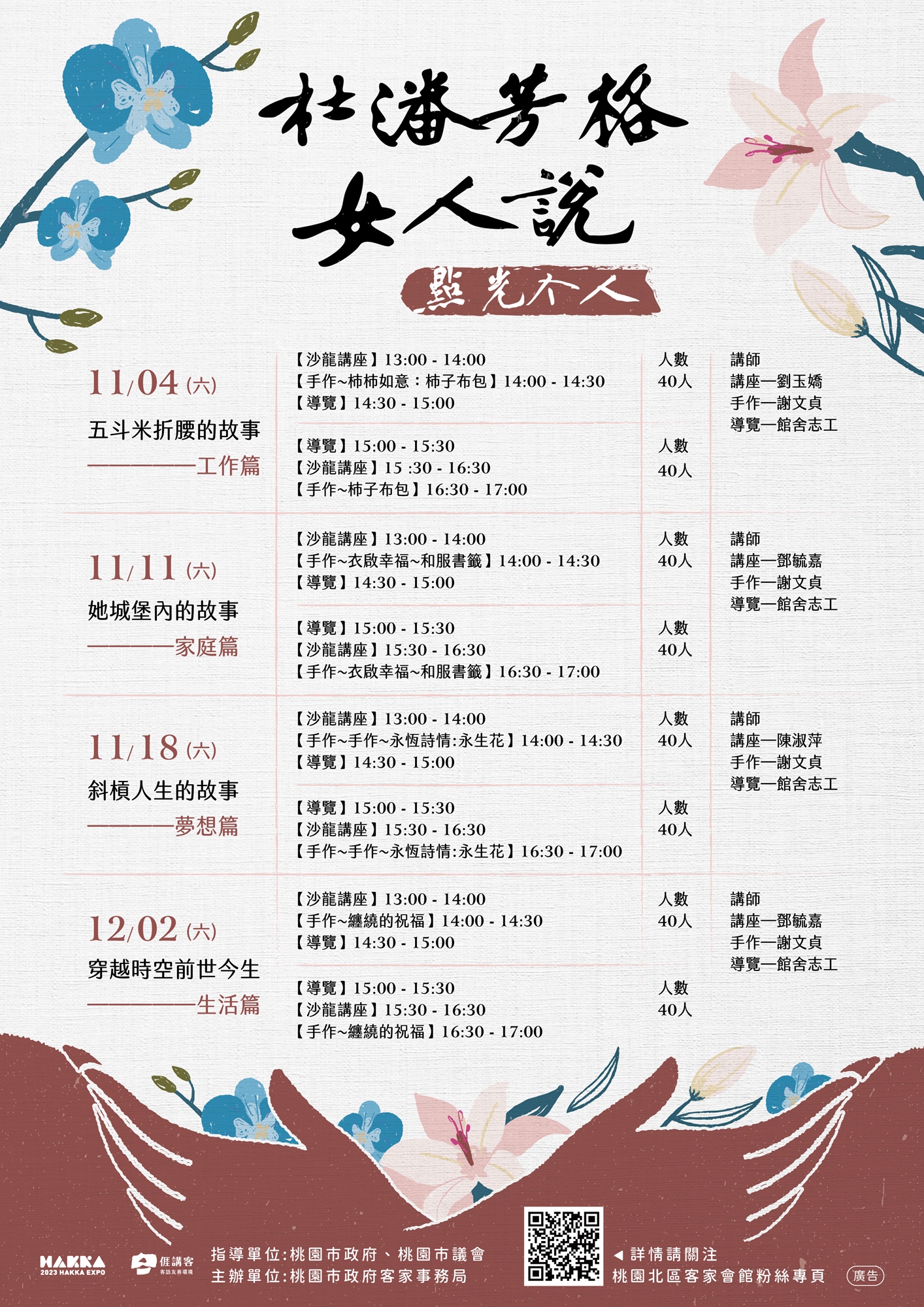 【活動內容說明】 婚後移居桃園中壢,擔任丈夫的醫務協助工作,同時自由寫作,也擔任插花教師的指導老師,從中探討生活中的處世哲理外,在創作上語言從日語、國語、客語間轉變,跨越語言辛苦面以及面對客語失傳的危機感所作的付出,此活動帶領大家因時代關係客語遭到漠視之下,杜潘芳格如何傳達母語的重要性。