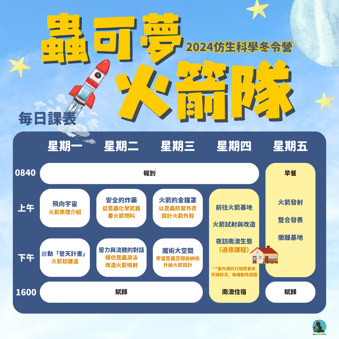 我們會由物理為起點去培養孩子的跨領域思考能力,往身邊的「蟲可夢」去尋找答案,才能發現原來昆蟲身上藏有這麼多的秘招呢!來一起運用昆蟲仿生科學建造出能飛最遠的水火箭,到宜蘭南澳的戶外實地完成親自發射火箭的夢想吧~