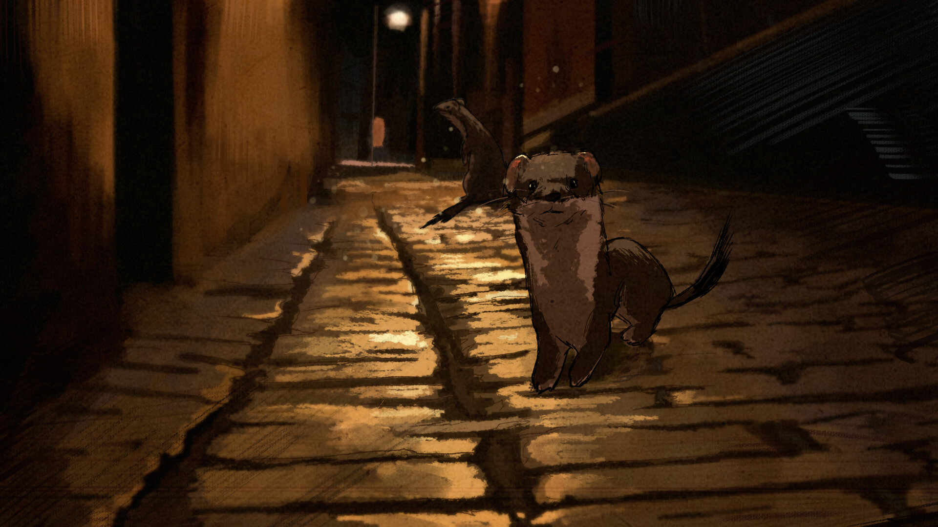 有一個寒冷而潮濕的早晨,兩只黃鼠狼在寧靜的街道上漫遊。它們曾在某個時刻分開,但最終重新團聚。就在那時,城市中響起了鐘聲和警報聲,黎明來臨了。