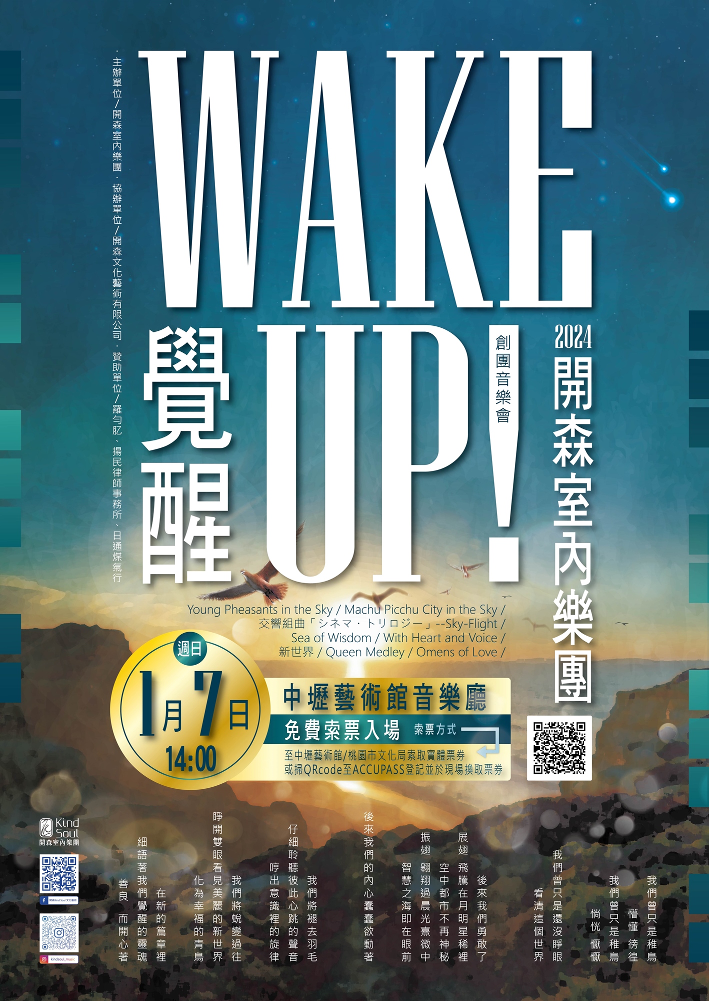 開森室內樂團之創團音樂會,以交響管樂團演譯一首首經典管樂曲目,音樂會主題為覺醒(Wake up!)將以詩詞貫穿音樂會曲目,包含 Young Pheasants in the Sky、Machu Picchu City in the Sky、交響組曲「シネマ・トリロジー」Sky-Flight、Sea of Wisdom 、With Heart and Voice 、新世界、Queen Medley、Omens of Love等經典曲目,形容一隻懵懂的雉鳥,如何展翅翱翔,褪去羽毛成為幸福的青鳥,並覺醒後,保有初心與善良的靈魂。