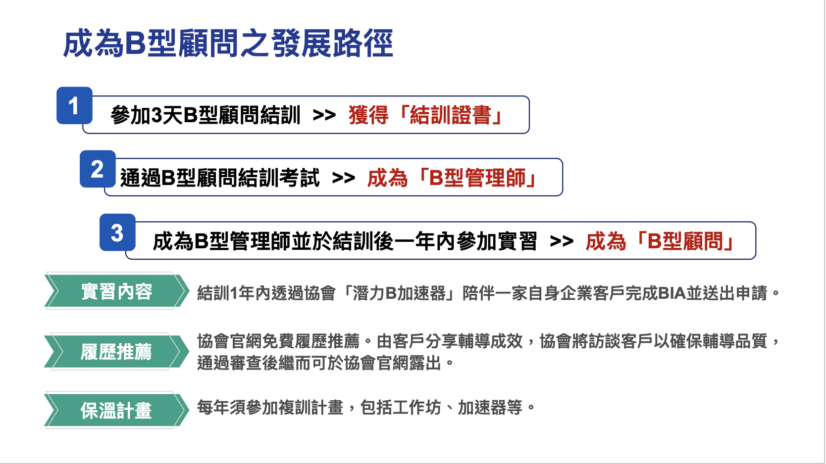 - 通過B型顧問結訓考試 >> 成為「B型管理師」