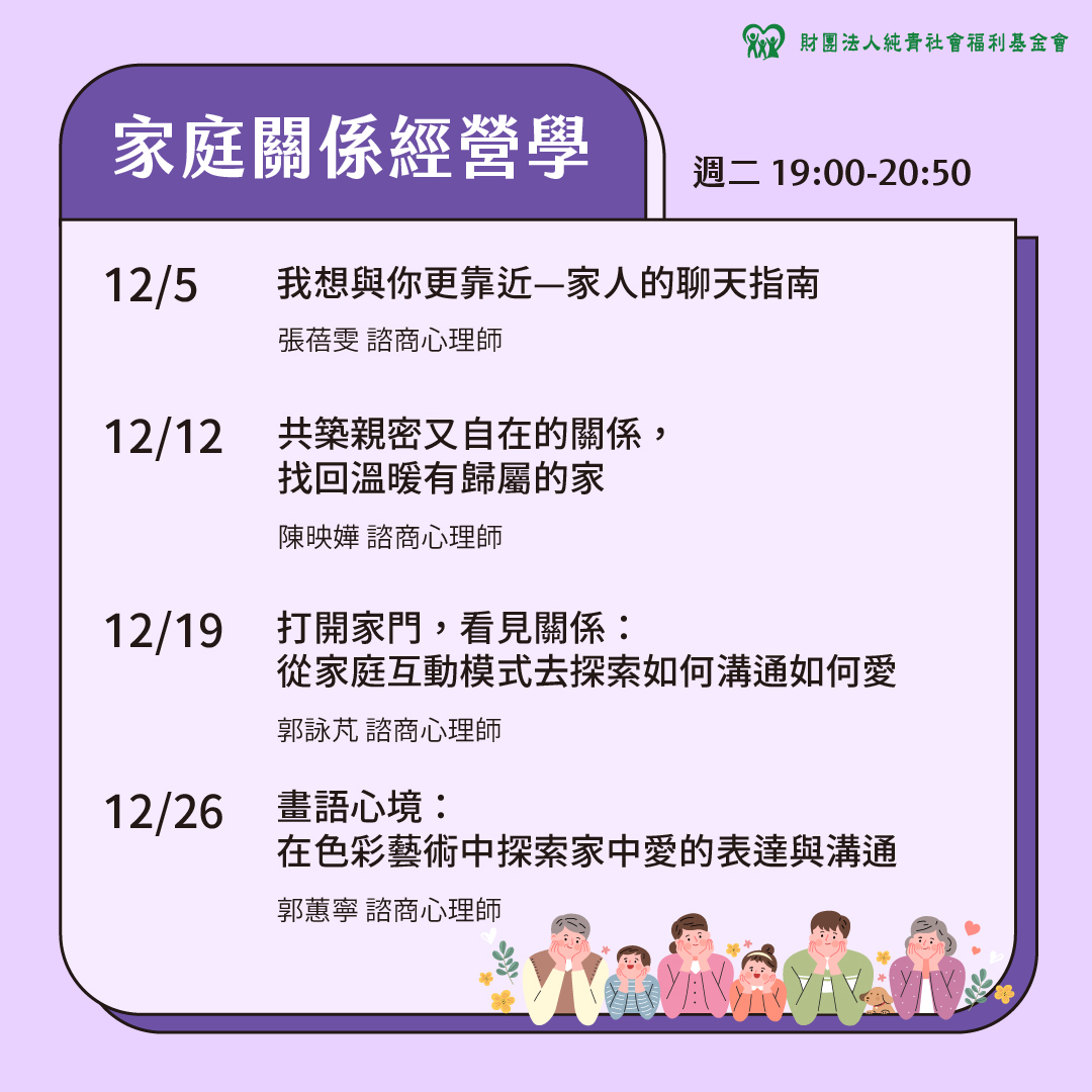 十二月週二 19:00-20:50 以家庭為主題的講座