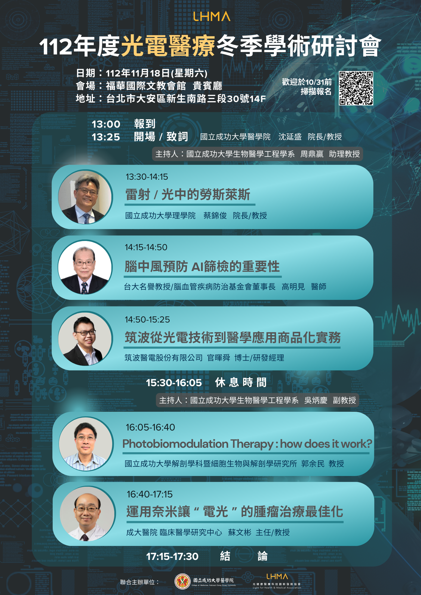透過專業講者的分享,您將深入了解光電技術的最新應用趨勢。無論您是醫療專業人士、研究學者還是企業家,這場講座將為您帶來前所未有的啟發和創新思維。不容錯過的商機就在眼前,帶您一同開啟光電醫療科技的未來之旅!