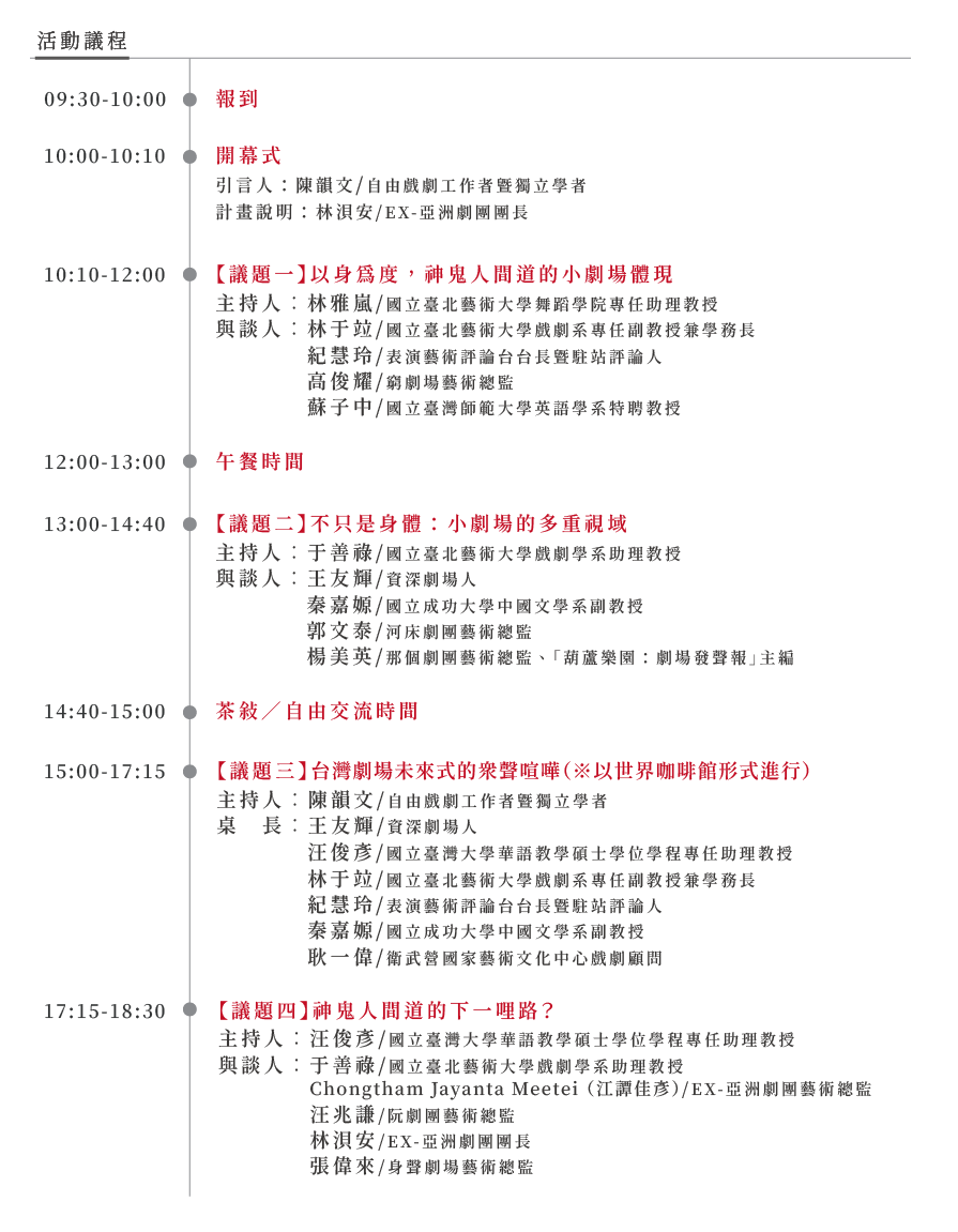 我們誠摰邀請關心台灣劇場的朋友共聚一堂,從「以身為度,神鬼人間道的小劇場體現」、「不只是身體:小劇場的多重視域」、「台灣劇場未來式的眾聲喧嘩」與「神鬼人間道的下一哩路」等切入點,從議題的開發與探觸,回應小劇場的召喚,一同匯聚藝術未來行動的能量。