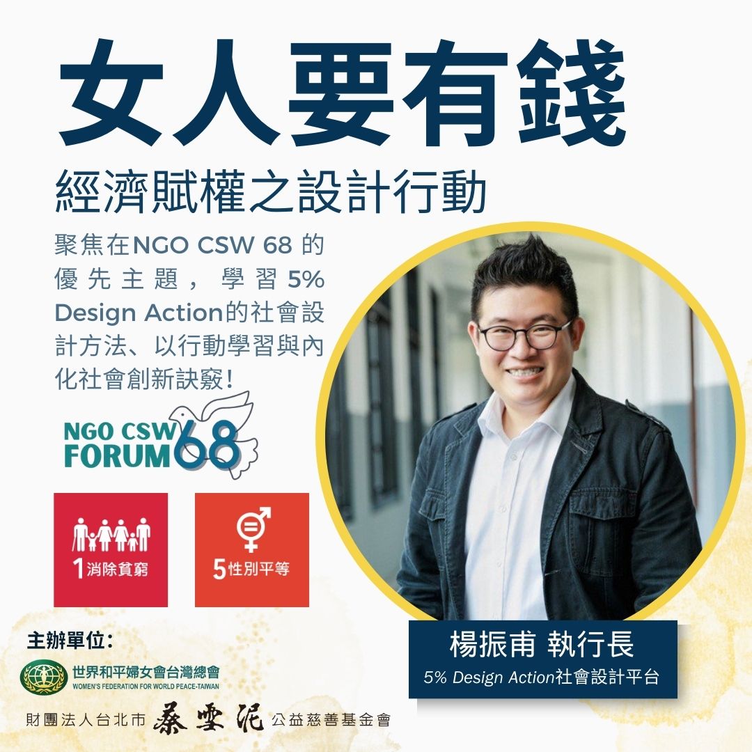 這講座將聚焦在NGO CSW 68 的優先主題-【從性別平等視角解決貧困並加強體制和融資,從而加快實現性別平等及增強全體婦女和女孩權能】。希望大家可以透過學習5%設計行動,將這些理念應用於女性經濟賦權中,並更有效地實現社會責任和永續發展。