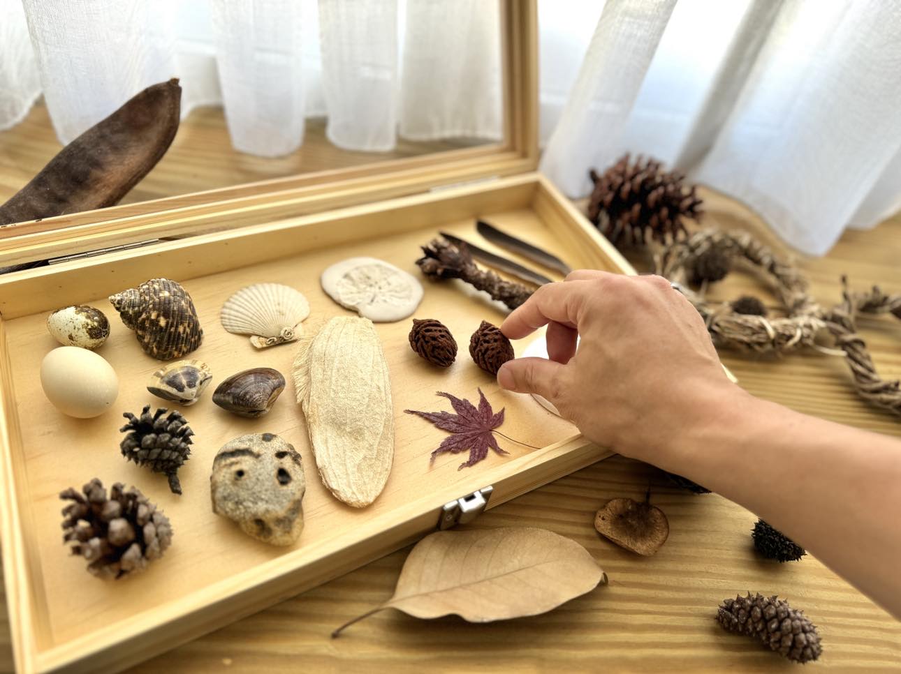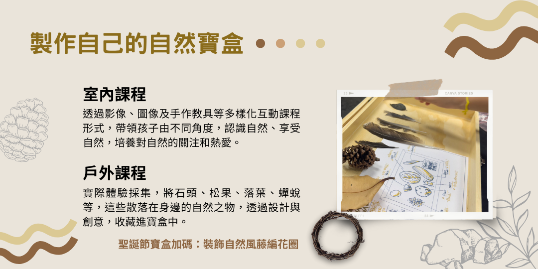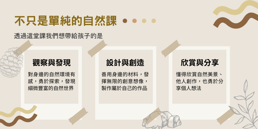 從你眼前可以撿拾的:可能是一片楓香、幾顆風乾的毧果、一束枯枝、一塊蟬蛻,甚或是帶著紋理與地質故事的石頭,在這些自然的寶物之中,發現最重要的寶藏就是仍然對世界帶著趣味與探索的一顆好奇心!
