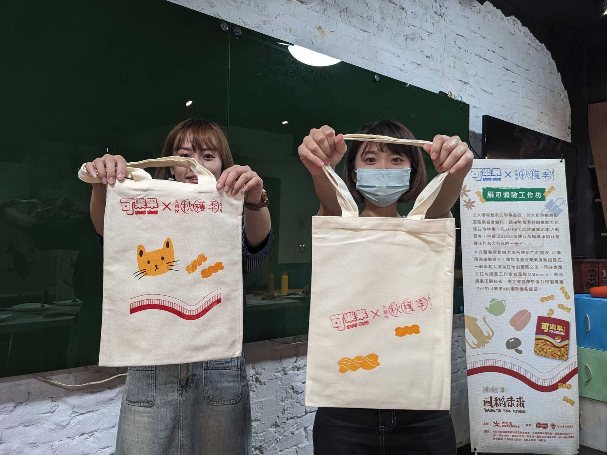 為了更貼近在地布類服裝產業特色,以及跨界多元可能,本次活動由大家所熟知的老朋友-可樂果為串聯媒介,螺旋造型可樂果像鞏固基底一般串起大稻埕在地的產業文化;同時也攜手在地版畫工作室岩筆模MBmore,透過版畫印刷技術,帶大家發揮想像力印製專屬自己的可樂果x秋穫季聯名提袋,僅有在這次秋穫季期間限定登場。