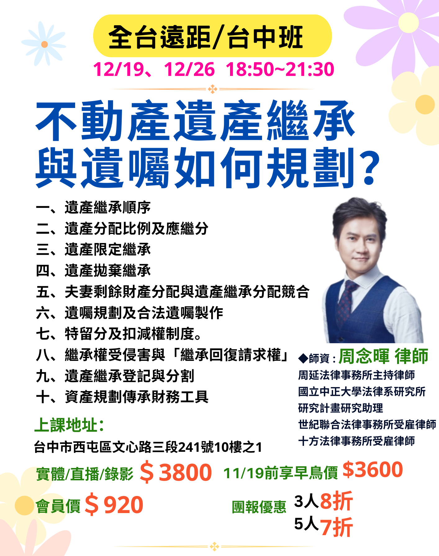 【台中實體課程/全台遠距教學】12/19起 不動產遺產繼承與遺囑如何規劃?