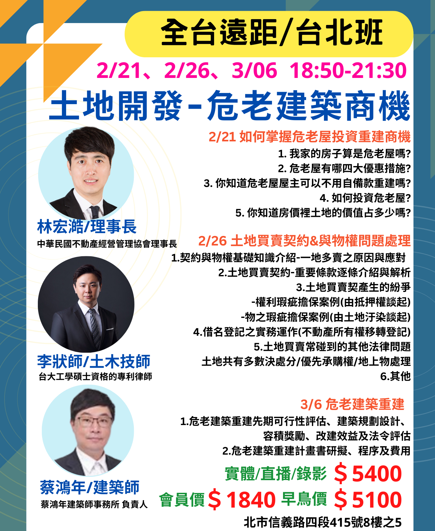 【台北實體開課/ 全台遠距教學】2/21起 土地開發危老建築商機