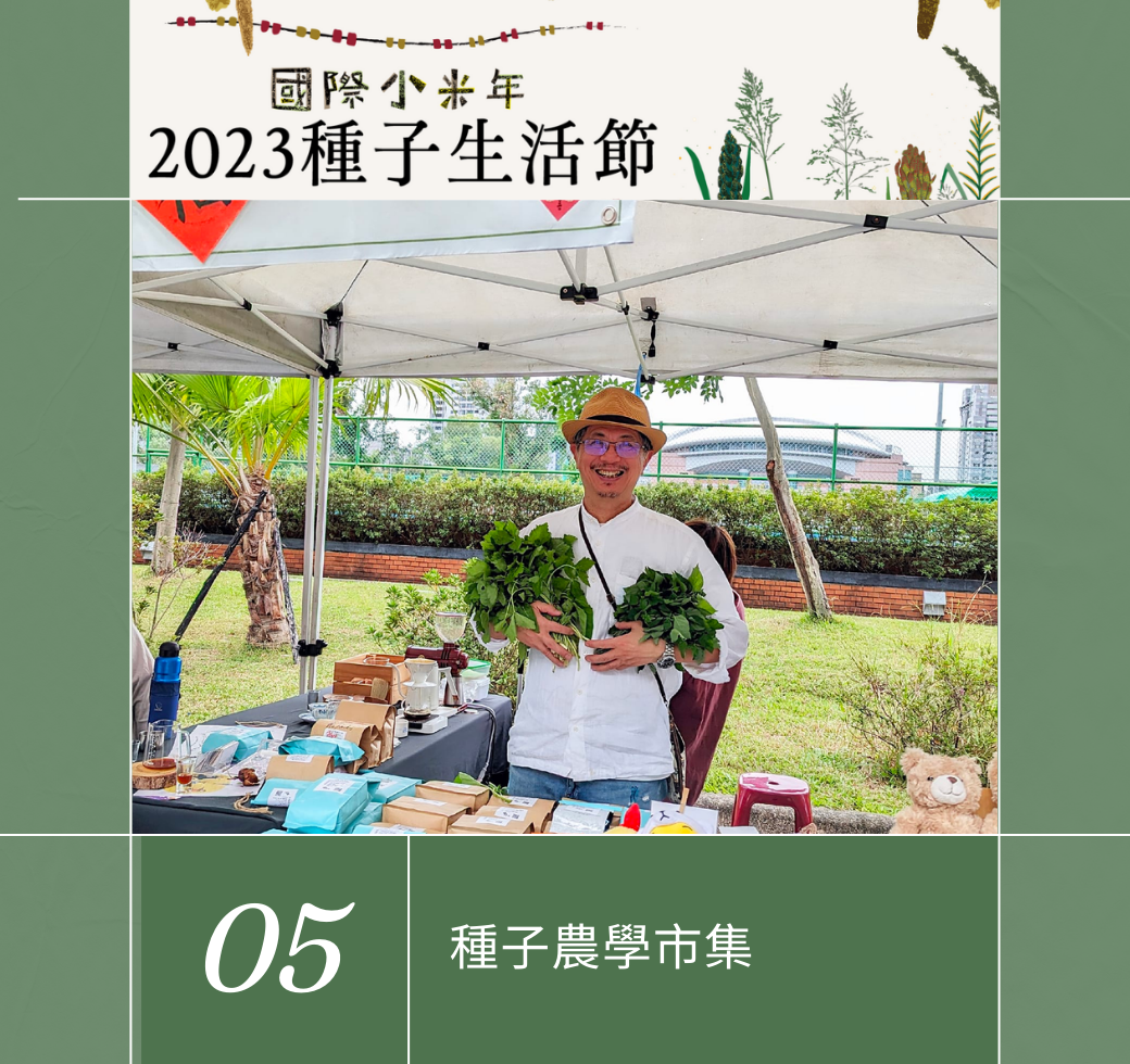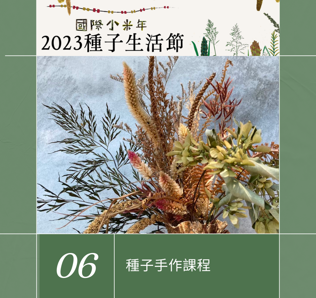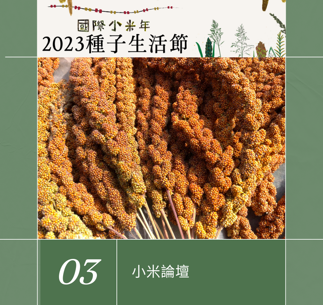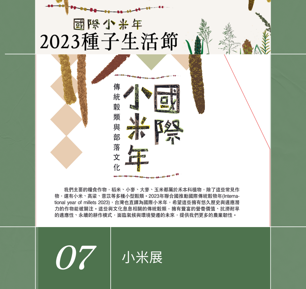 2023年種子生活節,呼應2022年底聯合國糧食及農業組織宣布2023年小米國際年(International Year of Millets, IYM 2023),我們以《台灣2023國際小米年》為題,透過小米論壇、保種市集、小米餐籃、小米餐酒共享、小米歌聲傳頌…,認識小米的重要性與神聖性,思考小米的釀酒、日常飲食、部落儀典、復耕計畫、及小米的未來性。