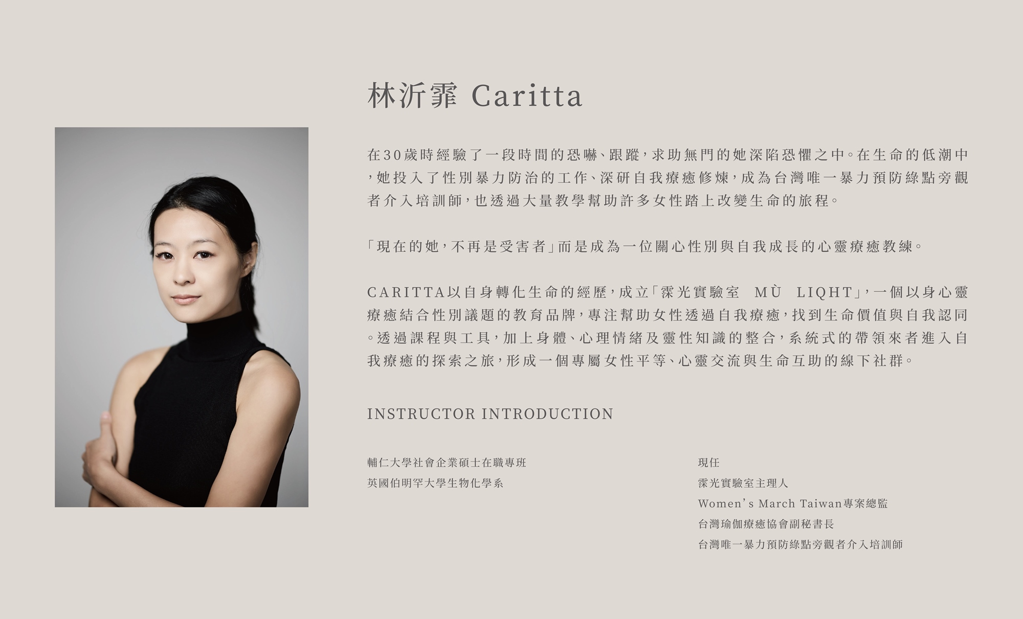 輔仁大學社會企業碩士在職專班英國伯明罕大學生物化學系 現任霂光實驗室主理人Women’s March Taiwan專案總監台灣瑜伽療癒協會副秘書長台灣唯一暴力預防綠點旁觀者介入培訓師——————————————————————