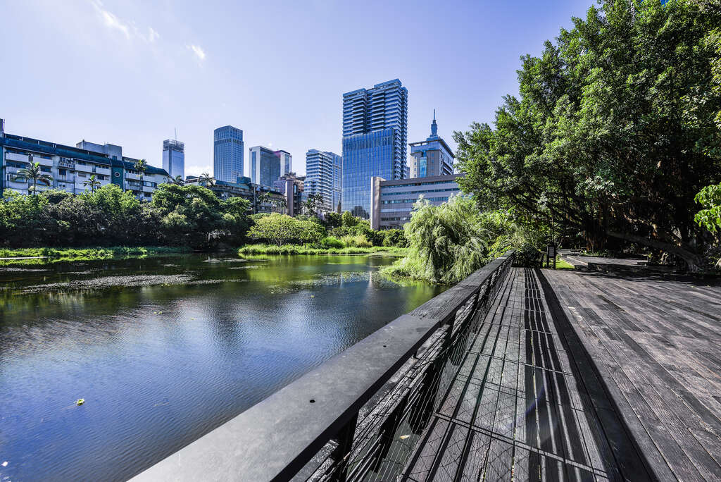 ▼昔日瑠公圳:啟建於1740年(清乾隆5年),開圳迄今280餘年,早期為台北地區重要的農田灌溉系統,昔日圳水清澈,楊柳低垂,風光明媚;隨著都市快速發展,農田逐漸消失,瑠公圳灌溉功能已不復存在。圖為最初仰賴瑠公圳支流供水的松山文劊園區生態池。