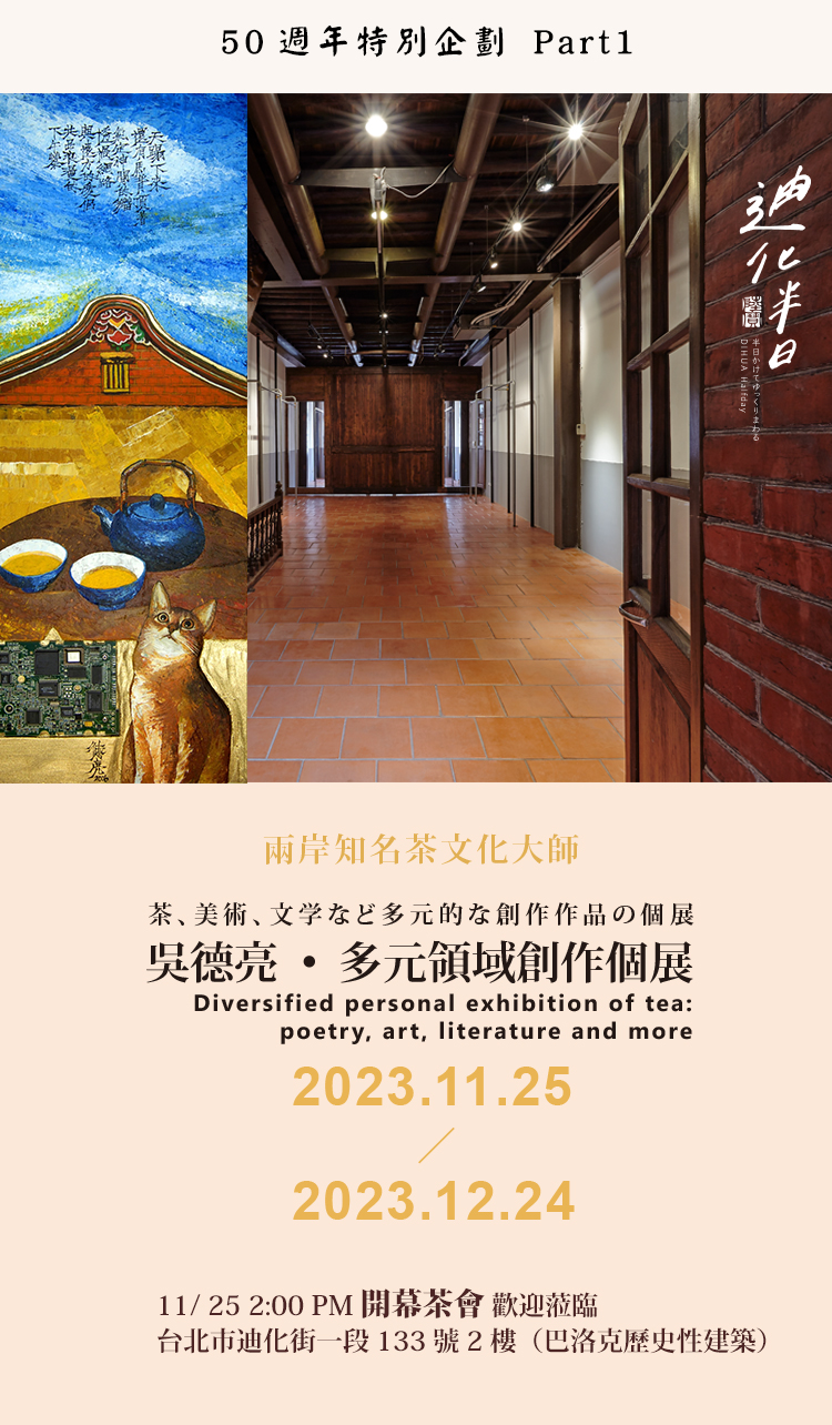 欣逢陸寶50週年,致力於推廣人文美學茶生活的陸寶LOHASPottery,特邀吳德亮老師,將其詩、書、茶、畫、木刻雕塑、陶瓷、漆器等,令人目不暇的多元創作,推薦給來自世界各地的朋友,在這以茶聞名的大稻埕百年老屋裡,別具時代的意義