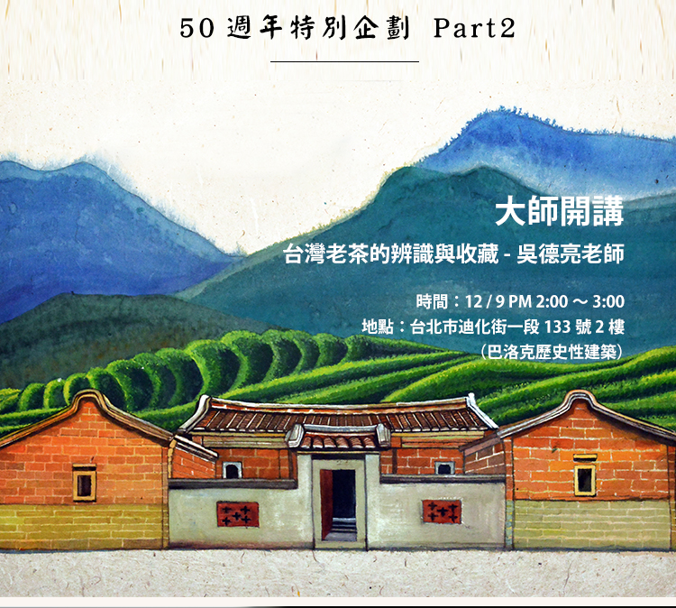 台灣老茶的辨識與收藏隨著普洱陳茶在兩岸掀起囤積及品飲的風潮,也帶動了台灣老茶的買氣及收藏。以往不及去化或刻意留存惜售的烏龍茶、包種茶,甚至新竹東方美人、魚池紅茶等,潛藏塵封數十年後紛紛鹹魚翻生,一時都成了奇貨可居的珍品,受歡迎的程度比起普洱陳茶可說有過而無不及,徹底顛覆了台灣茶一向「以鮮為貴」的觀念,一時之間茶界也掀起老茶品飲及藏茶的風氣。講座內容將會教大家,