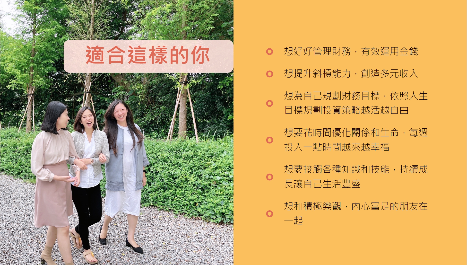 以媽媽永續成長社群的初衷,針對財務安全、自我增值、斜槓創收三大主軸,集結不同領域專長媽媽們設計多元學習方式和計畫,建立一個能夠陪伴彼此持續學習的社群,用自己的力量打造美好理想生活。