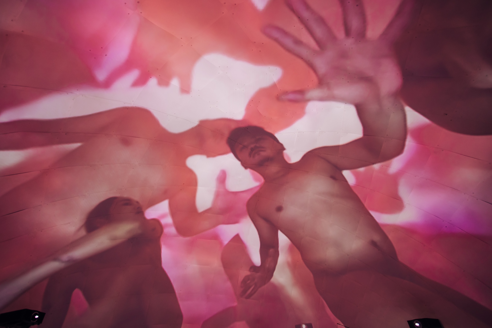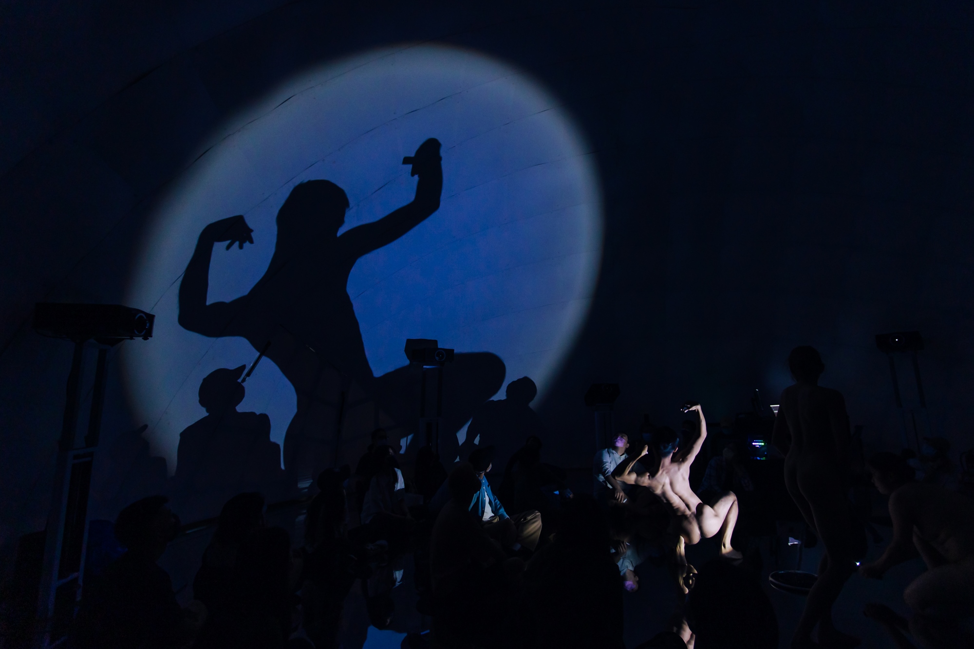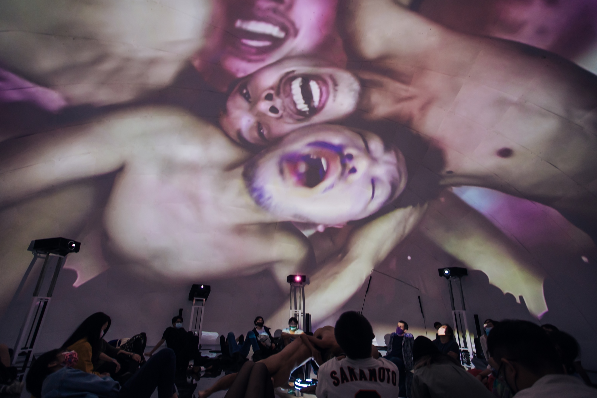 以數位實驗建築著手,今年突破過往尺度,重新打造升級版的戶外穹頂劇場(DOME)。內部空間從地板、牆壁到天頂為一體化的球體,巨大半圓形的沉浸式投映涉及球形曲面投影的多項複雜技術,創建出一處沉浸式場域及近似於「裸眼VR」效果,期望帶給觀眾「未來視覺」的前衛觀演經驗。