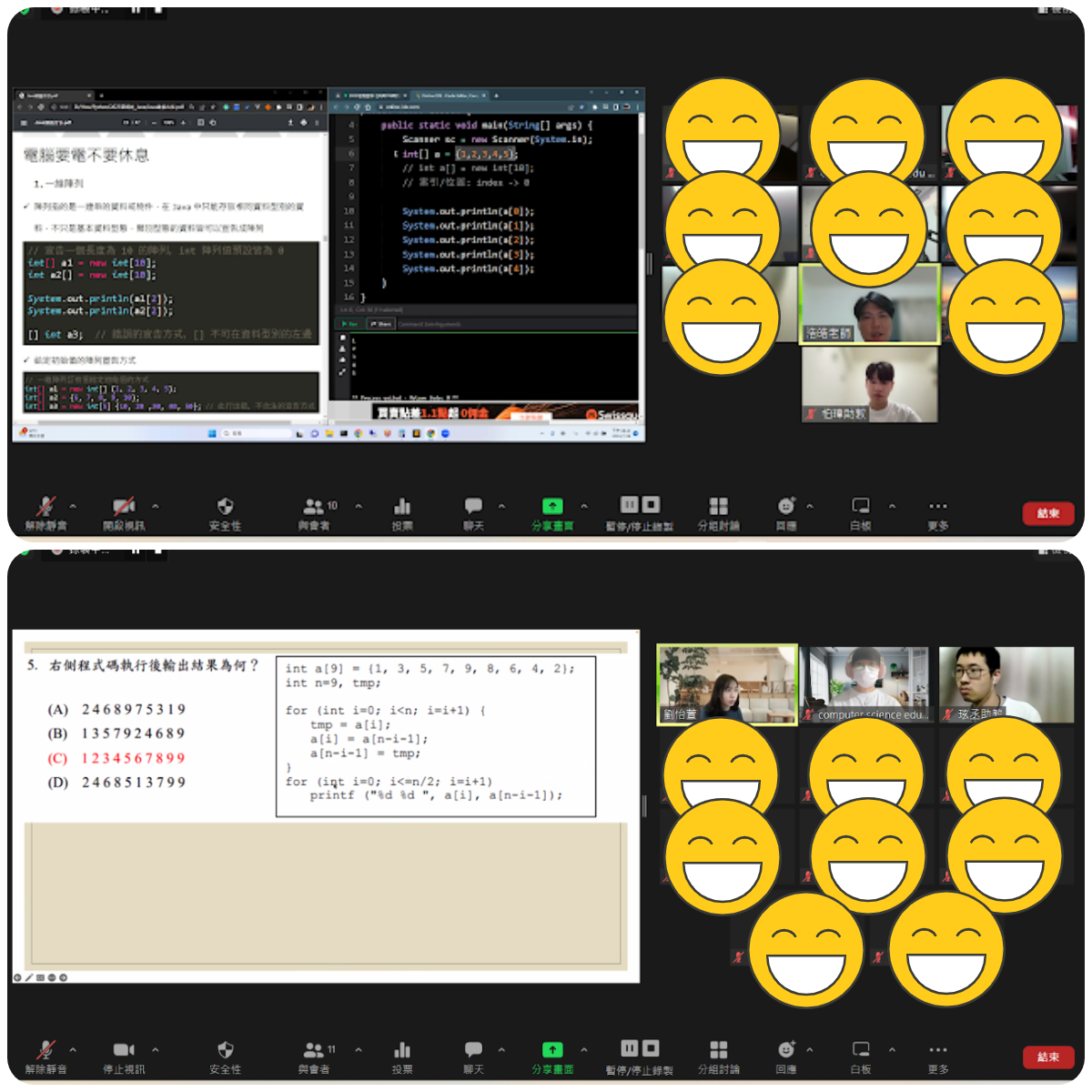 遠距線上視訊程式課程,上課使用zoom、google classroom、程式軟體進行,強調互動及實作,孩子遇到程式問題,可以分組討論、分享畫面、遠端操控,班級除主要講師一位,同時搭配相關科系的助教跟課協助孩子。