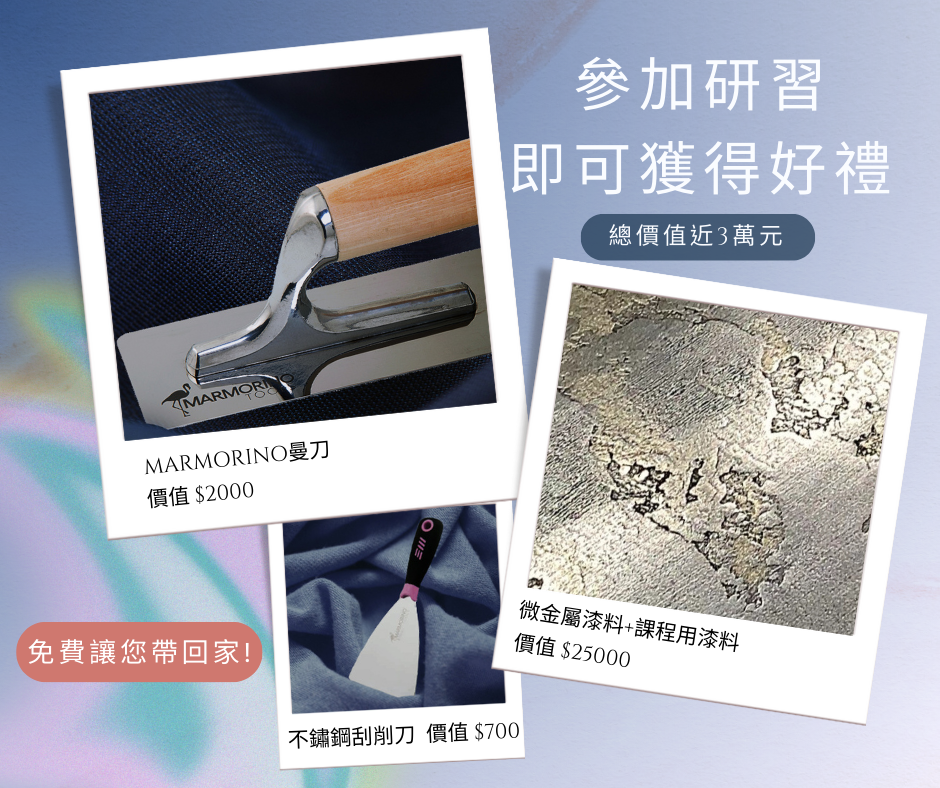 課程提供3種以上的義大利塗料品牌,讓大家跟隨業師一起完成創作以外,也可以嘗試混和做出不一樣的藝術漆效果,現場也提供多家塗料廠商的資訊,並有漆料代理商隨時解決學員們漆料訂購等問題。
