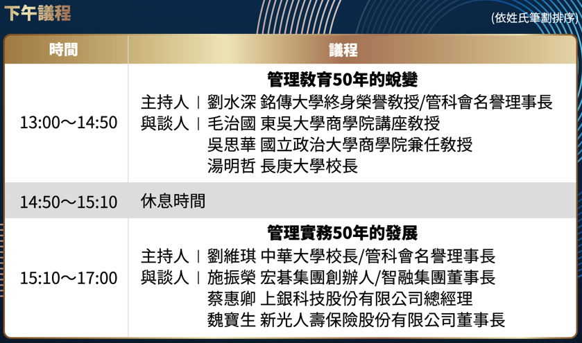 社團法人中華民國管理科學學會今年籌辦「管理五十回顧、現況與挑戰」研討會,並以「管理教育50年的蛻變」及「管理實務50年的發展」,透過資深管理學者及企業家來分享過去50年來台灣管理教育及產業界之變遷歷程,望眼未來教育及產業界如何邁向新希望與新格局。