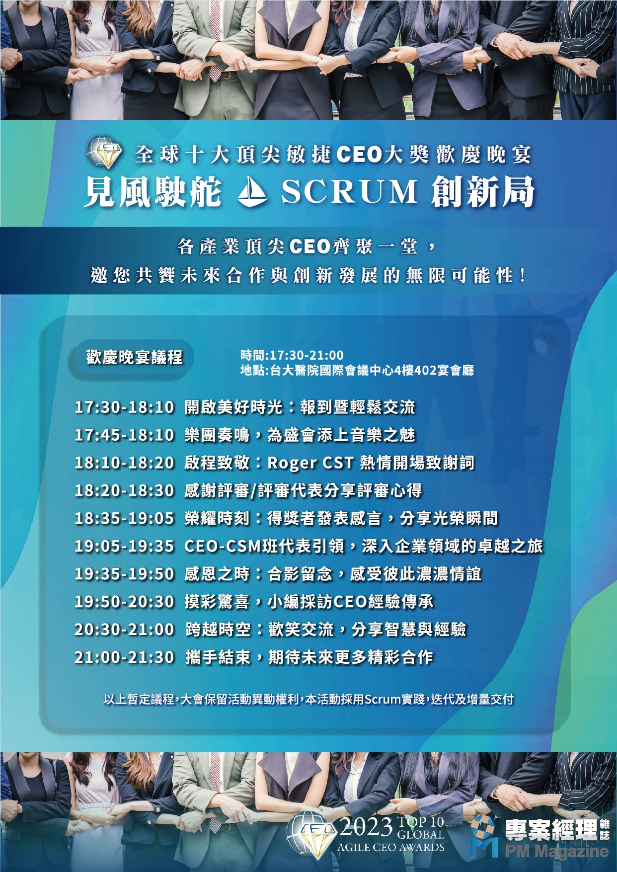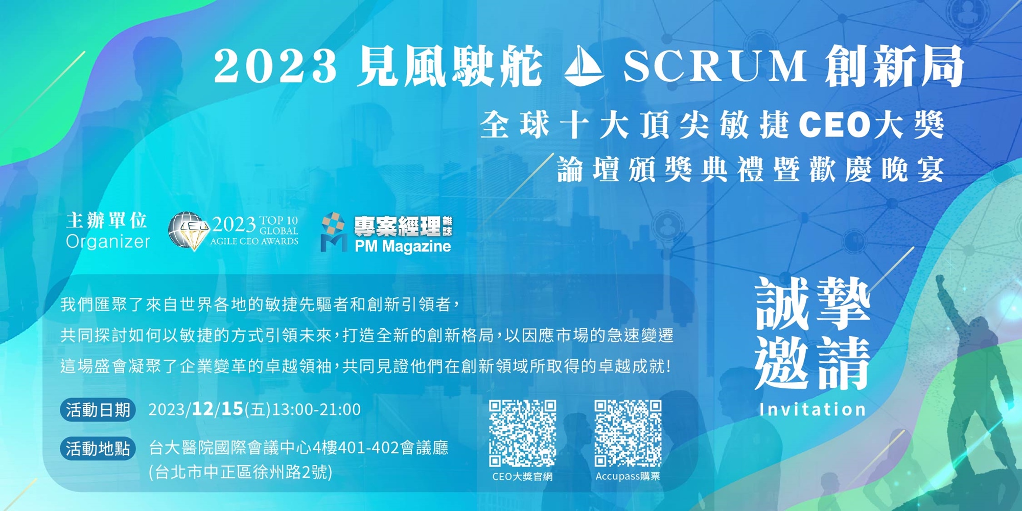 我們誠摯地邀請您參加2023年全球十大頂尖敏捷CEO論壇頒獎典禮,在這裡,您不僅會見證敏捷領導力的卓越表彰,還將各產業翹楚共襄盛舉,共啟未來,也為台灣敏捷史開啟新的一頁。 期待您的積極參與,一同探討如何充分發揮CEO的領導力、敏捷能力,以在市場變革中抓住機會,開創新局,我們期待著與您共同探討引人入勝的議題。