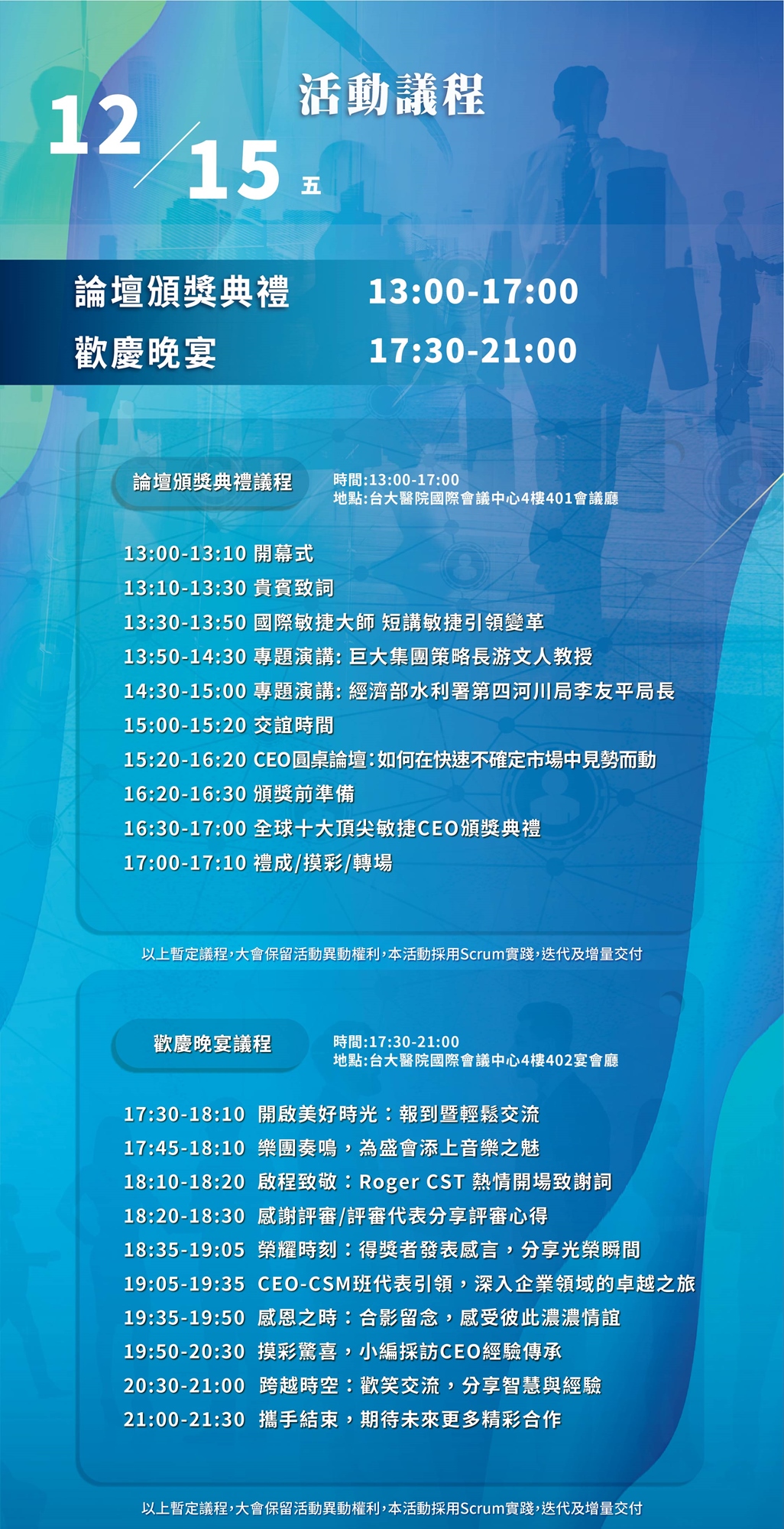在本次CEO 齊聚活動,集結了具備全球視野的企業領袖,包含產官學界,也邀請全球敏捷國際認證最多持有者及權威-Scrum Alliance 的現任 CEO 擔任Keynote Speaker 及 國外CST 共同分享敏捷前瞻洞察與實踐智慧。同時,還安排有圓桌論壇及Q&A ,共同探討"敏捷引領變革:CEO如何在快速不確定市場中見勢而動 ,活動中也將共同見證十大敏捷CEO 大獎得獎人頒獎。