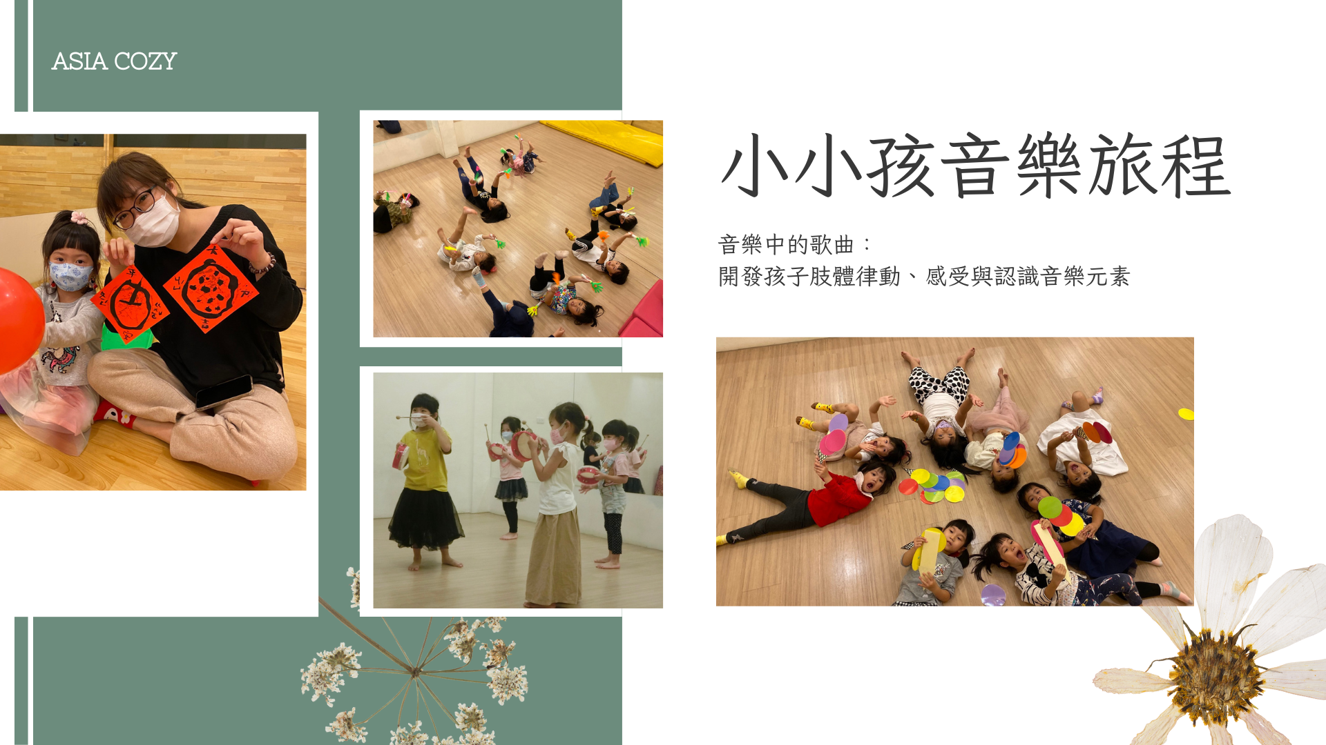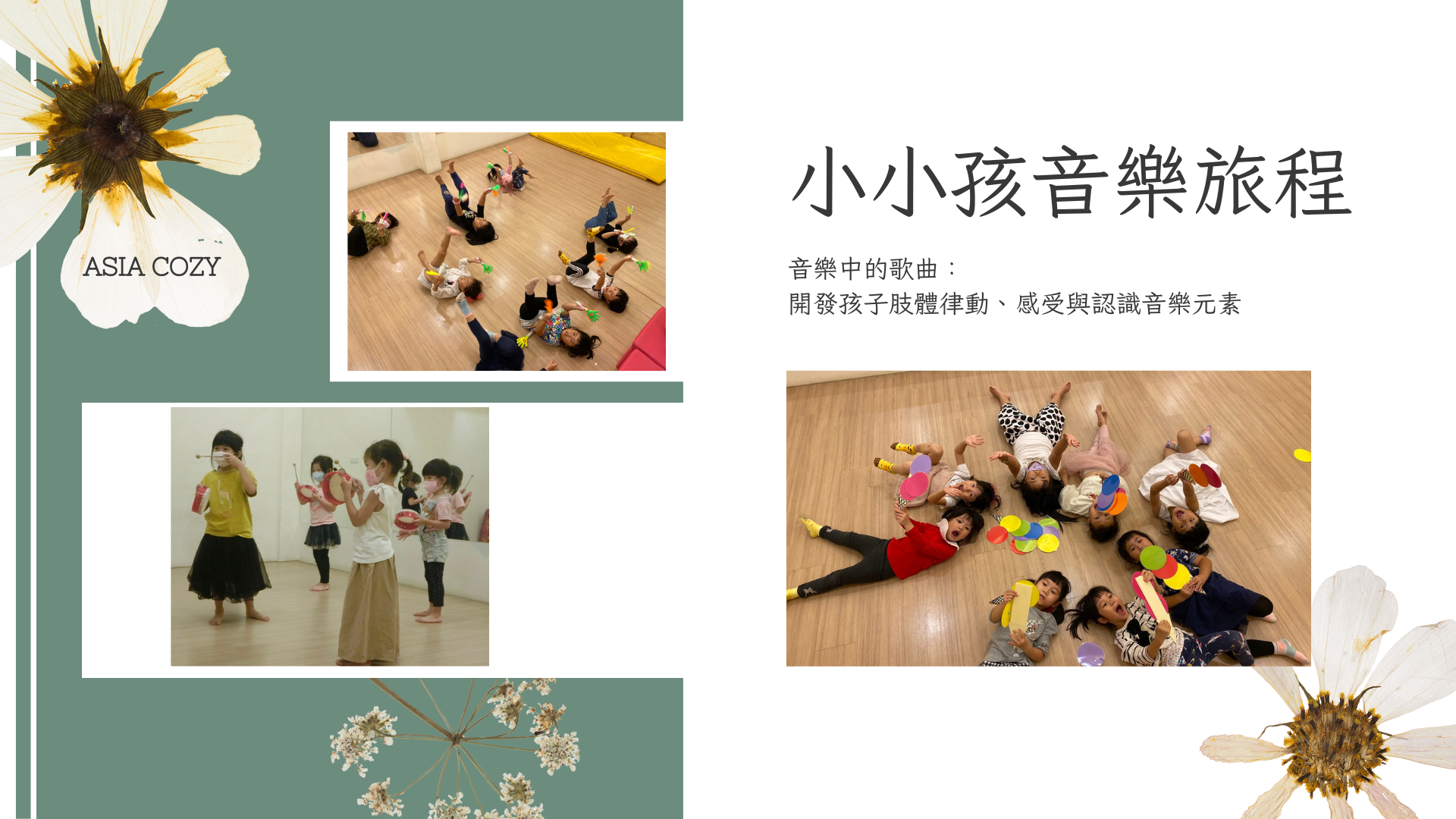 使用各種不同的道具及樂器讓孩子練習大小肌肉群,並且帶孩子發揮創意和想像,一起玩音樂!團體互動:課程中透過好玩又有趣的團體活動讓孩子學習生活常規與同儕團體互動
