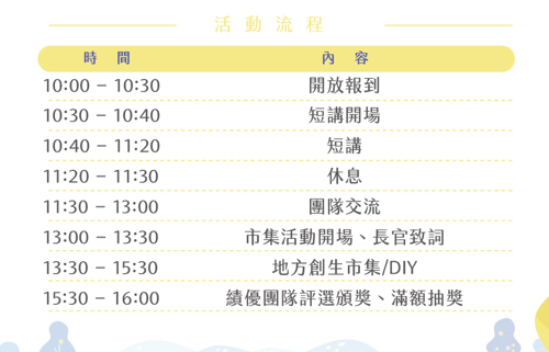 當日10:00~10:30需至服務台報到,參加主題交流活動(10:30~11:30),認識地方創生團隊。