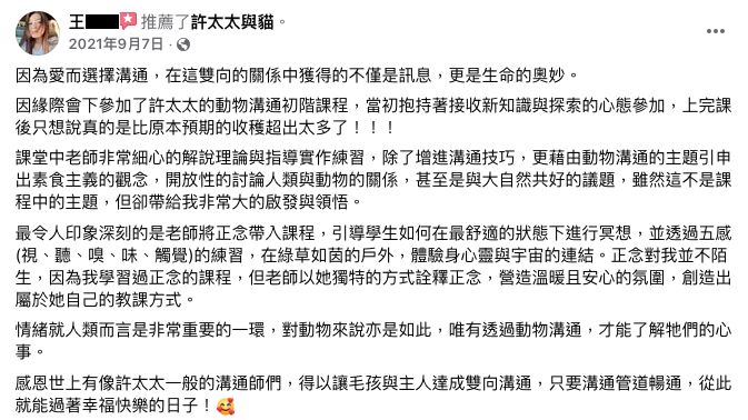 兩天的課程裡,許太太用簡單的方法帶學員慢慢回到平靜的自己,覺察內在細微變化,打開心和動物連結,親自接收動物對你說的話,體會他的心情,感受他超越言語的愛和溫暖。