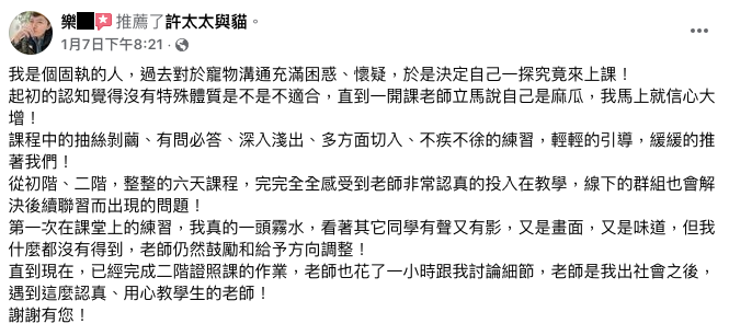許太太是持續接案的職業動物溝通師,在課程裡真切分享長期累積豐富的案例和練習經驗,並清楚知道初學學員正在及即將經歷的練習過程,盡可能給予各式協助,探索與動物心靈交流的深度和廣度。