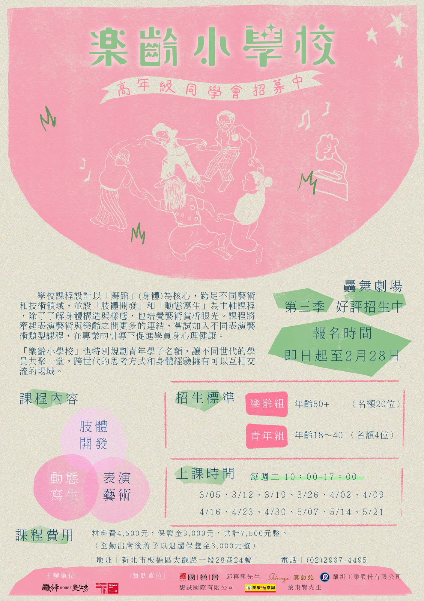 學校課程設計以「舞蹈」(身體)為核心,跨足不同藝術和技術領域,並設「肢體開發」和「動態寫生」為主軸課程,除了了解身體構造與樣態,也培養藝術賞析眼光。課程將牽起表演藝術與樂齡之間更多的連結,嘗試加入不同表演藝術類型課程,在專業的引導下促進學員身心理健康。