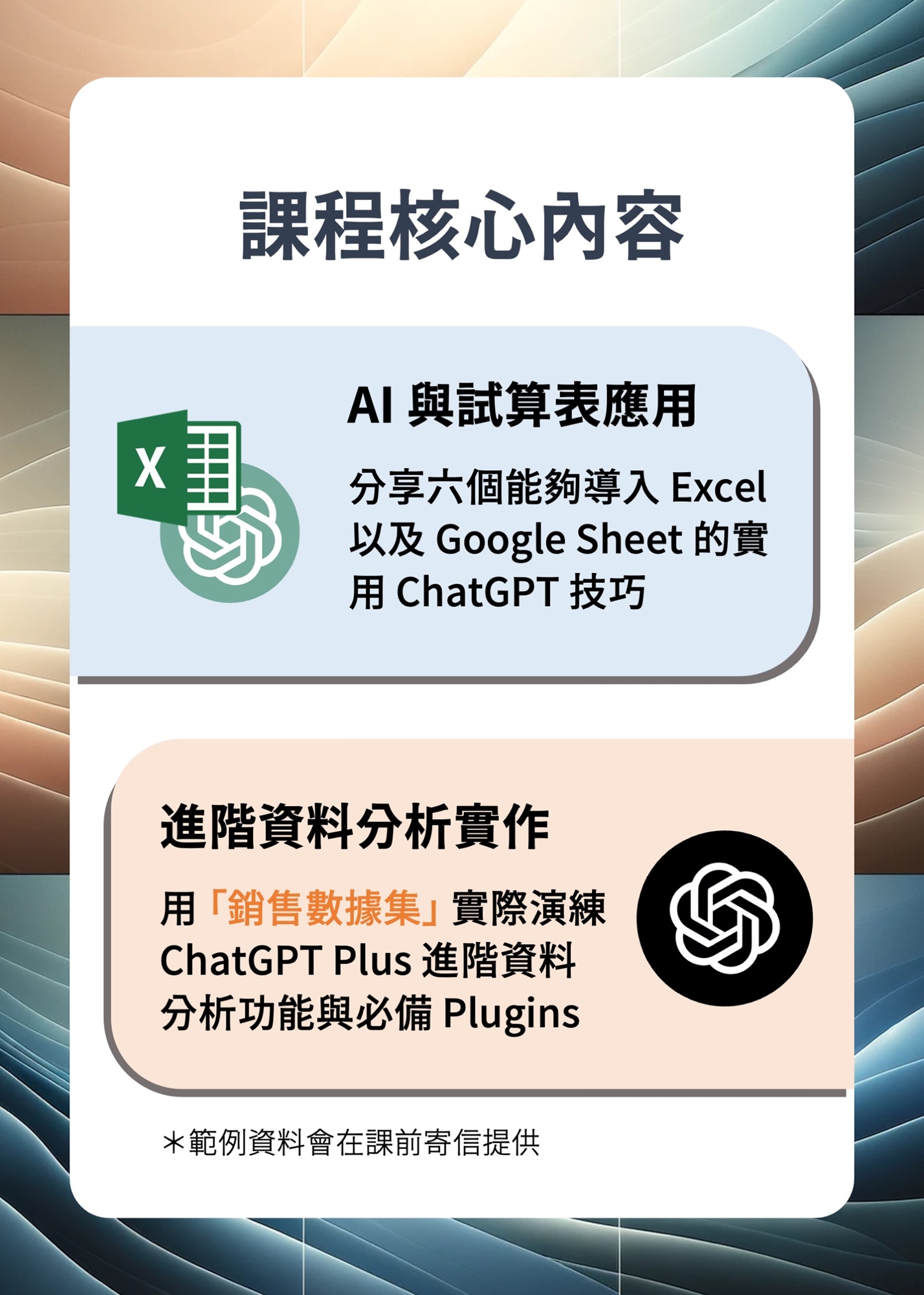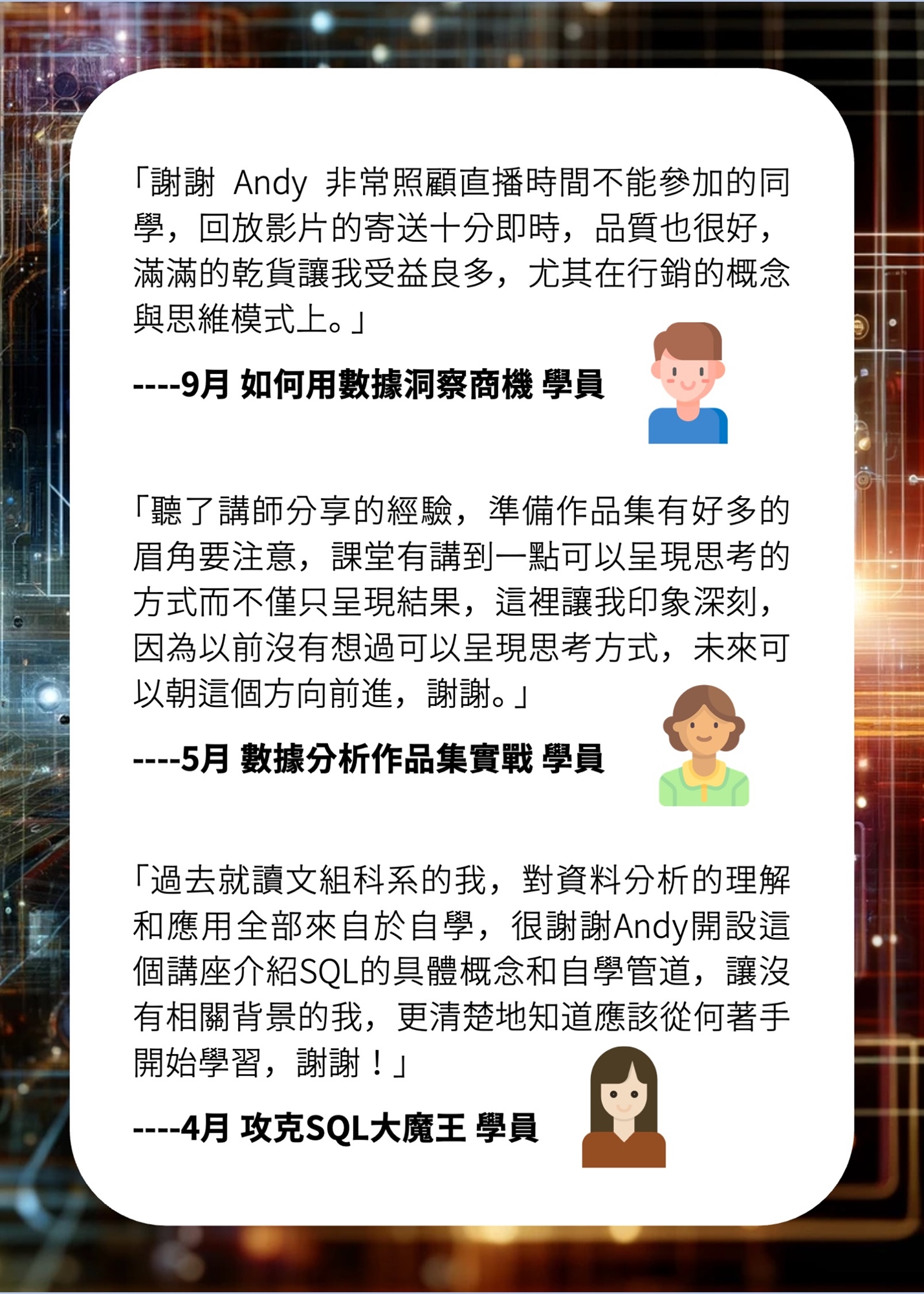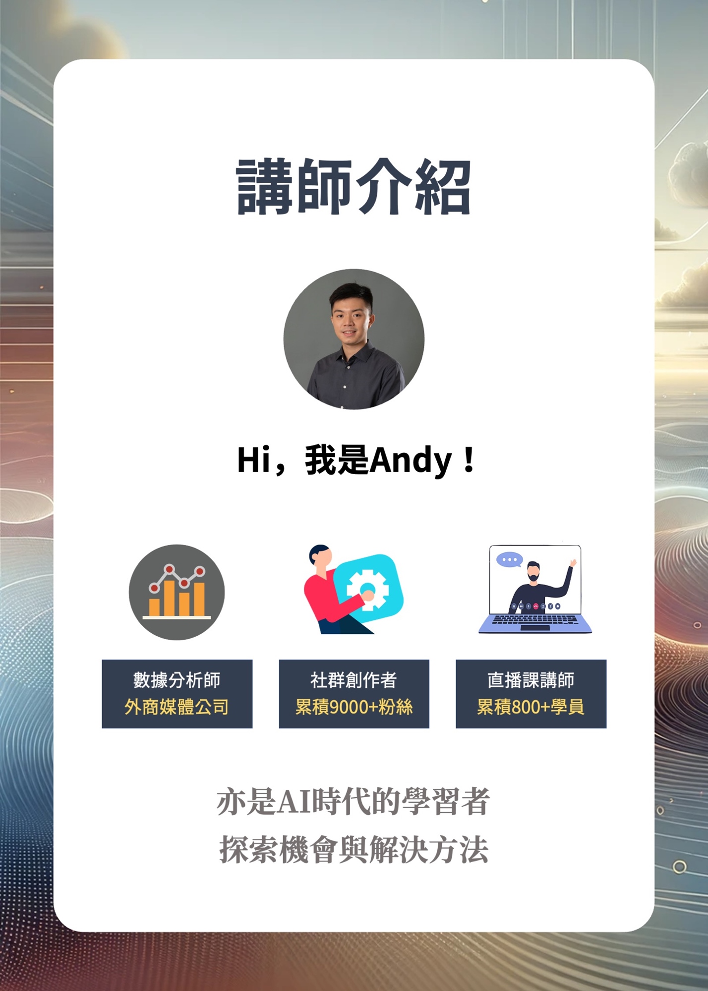 我開設這堂課的目的,是希望能幫大家從眾多的AI資訊當中,擷取出那些「對於數據分析有幫助」的部分,並以實際的數據分析流程進行演練!