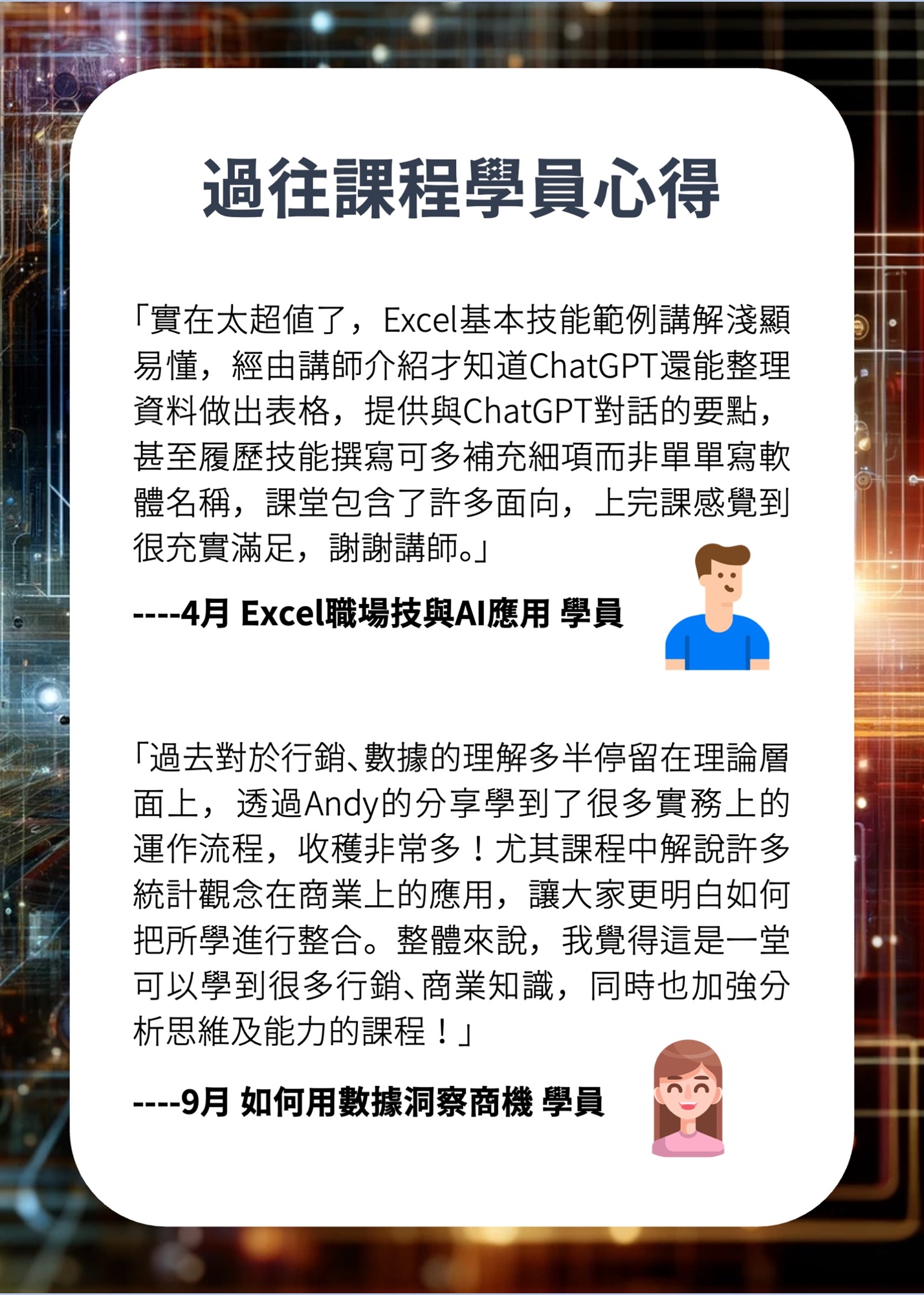 A﹕不論你是數據分析師、工作中需要運用數據的工作者、學生、或是想了解如何整合AI技能提升工作效率,這堂課都很適合你!
