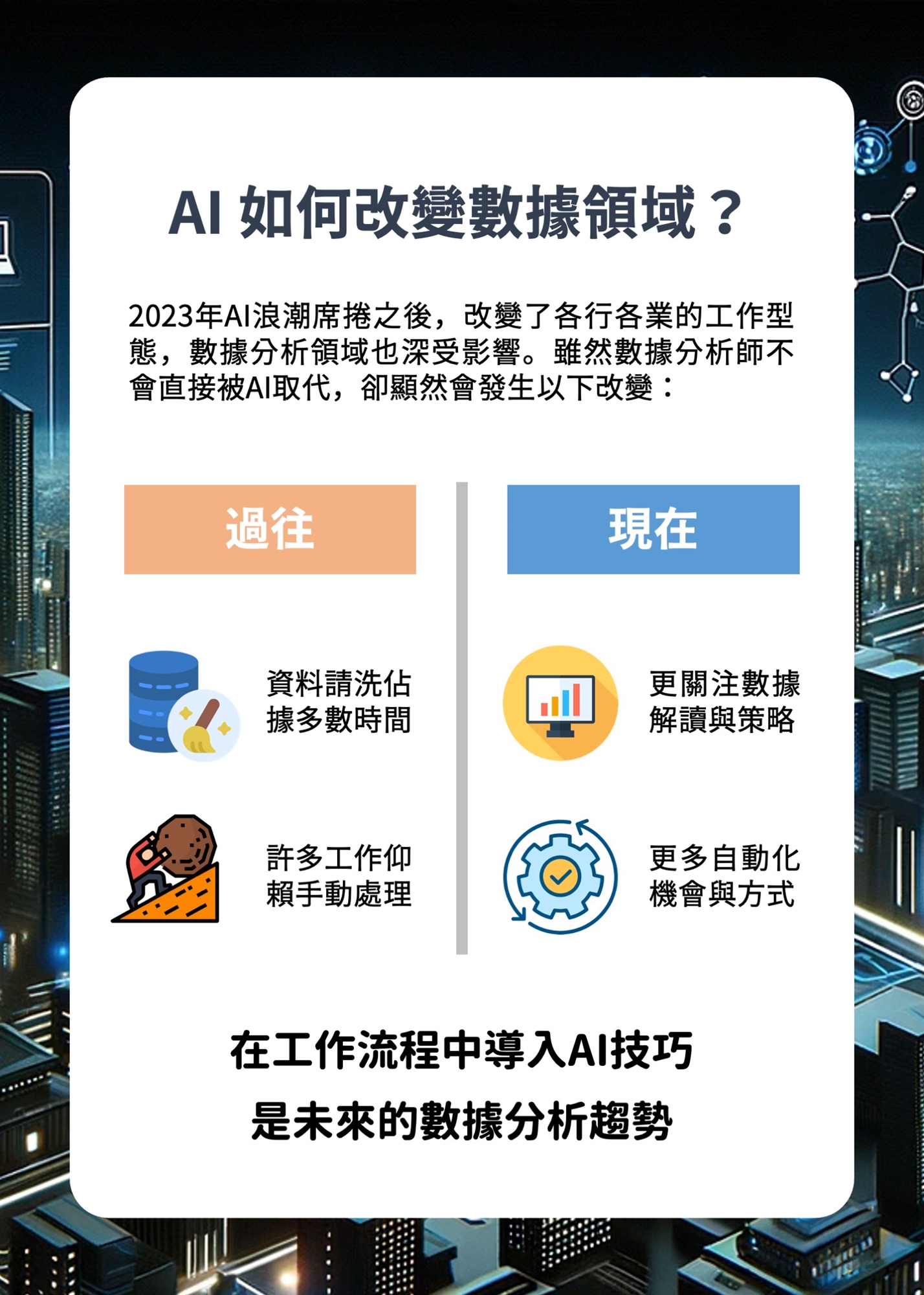 數據分析師雖然暫時不會被AI取代,但顯然,認識AI、善用AI提升工作效能,已經成為每個數據人必須迅速準備起來的項目。