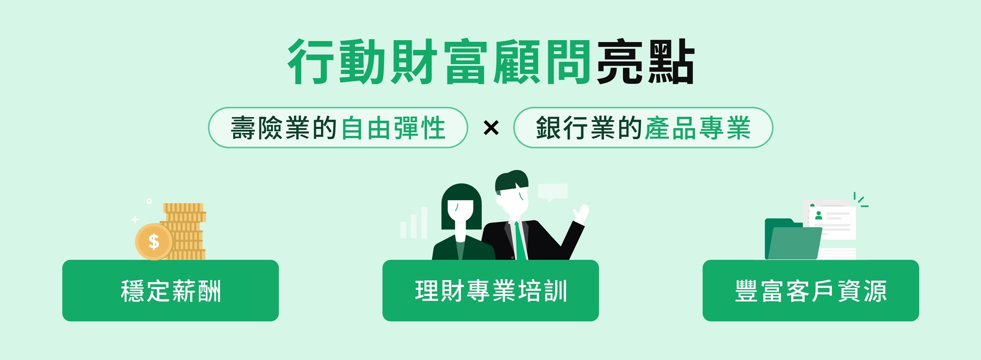 行動財富顧問 專為保險業務員量身設計,結合保險業的自由彈性與銀行業的產品專業,探索你的職涯新選擇。