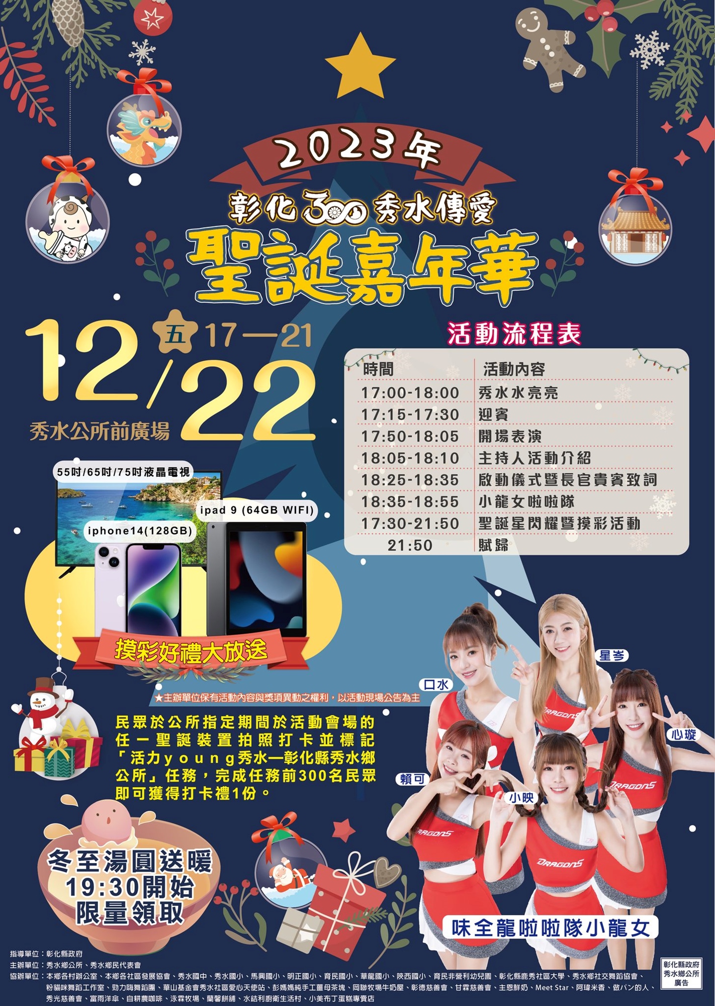 秀水鄉公所,要營造秀水鄉溫馨氣息,同時配合冬至傳統節氣,特結合聖誕裝飾、湯圓送暖、聖誕晚會表演及聖誕市集等,在聖誕節前夕,籌辦相關活動,冀透過精彩節目行銷本鄉並辦理活動,要為秀水鄉居民帶來祝福,讓2023年的歲末,共同慶祝彰化建縣300年,透過本次活動將秀水的活力傳達出去!