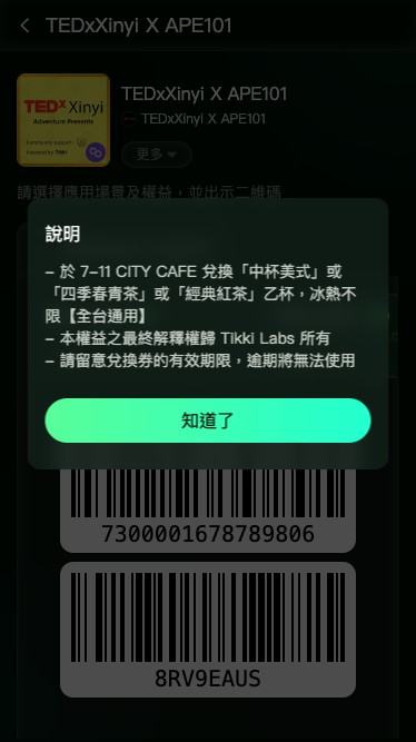 - 虛實應用:此次活動可同步體驗到基於NFT的虛實結合應用,凡參加活動的成員均可於本活動上獲得專屬的紀念NFT,該NFT可於全台任意7-11 門市兌換領取一杯「中杯美式/ 四季春青茶或經典紅茶 」咖啡(該服務由Tikki提供技術支持)
